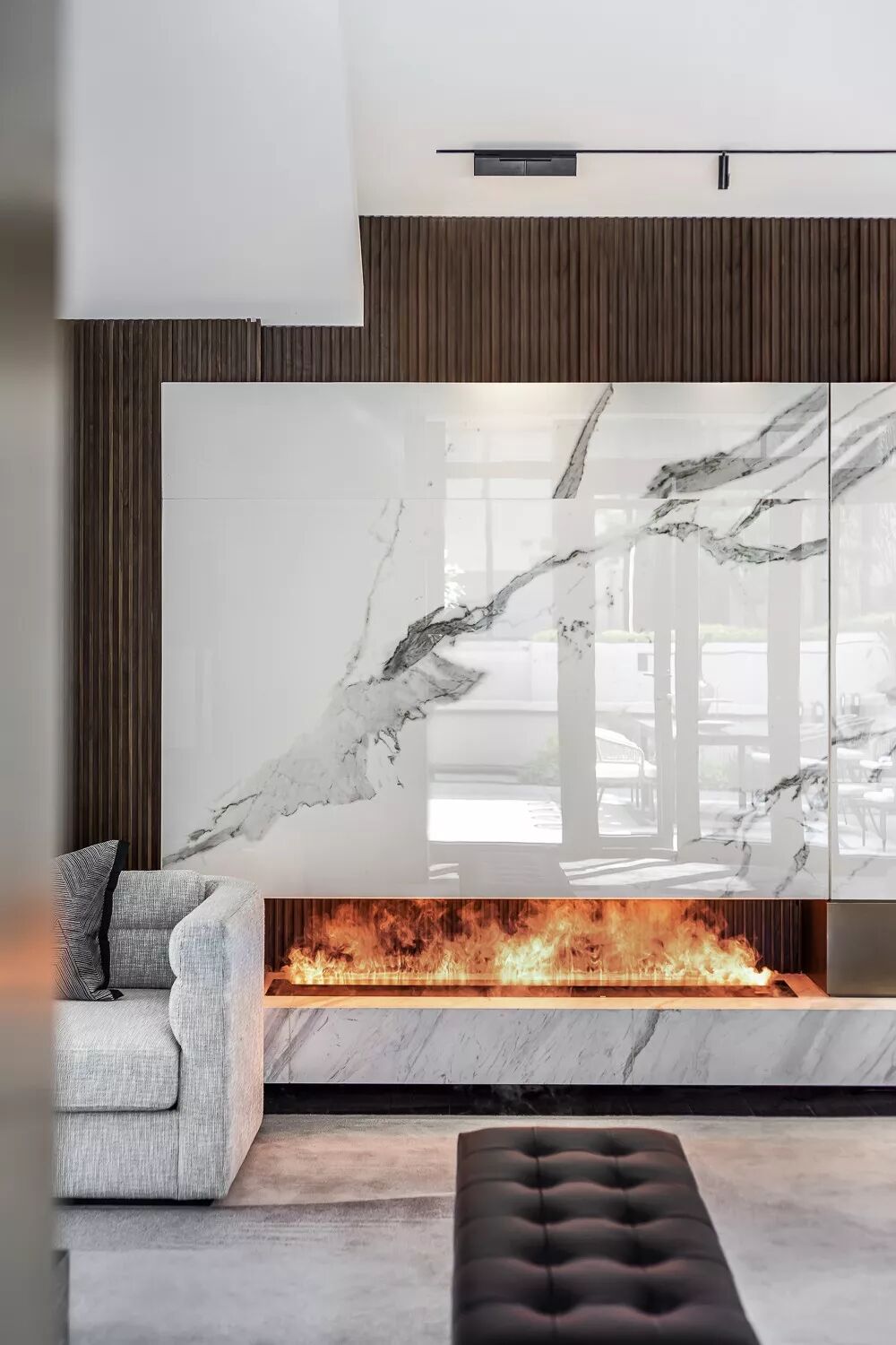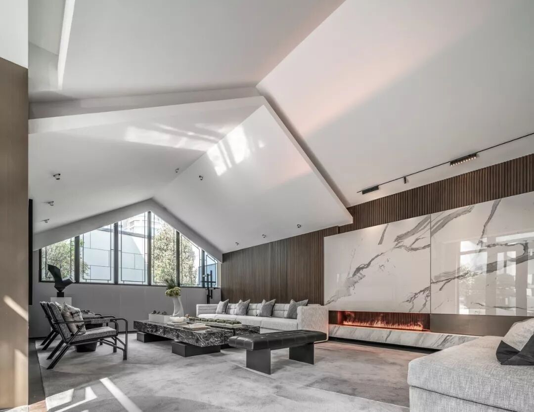 整个休息区通过巧妙地座椅布局划分为两个区域,既具沟通性又各有磁场,很好体现了功能与美学的平衡。双层挑高的天花板采用围合的设计,捏塑空间的立体感,大面积落地窗引入天光,黑色纹路大理石茶几,深褐色木质格珊、浅灰色沙发及明烈的炉火,构成一幅品质感十足的画面。