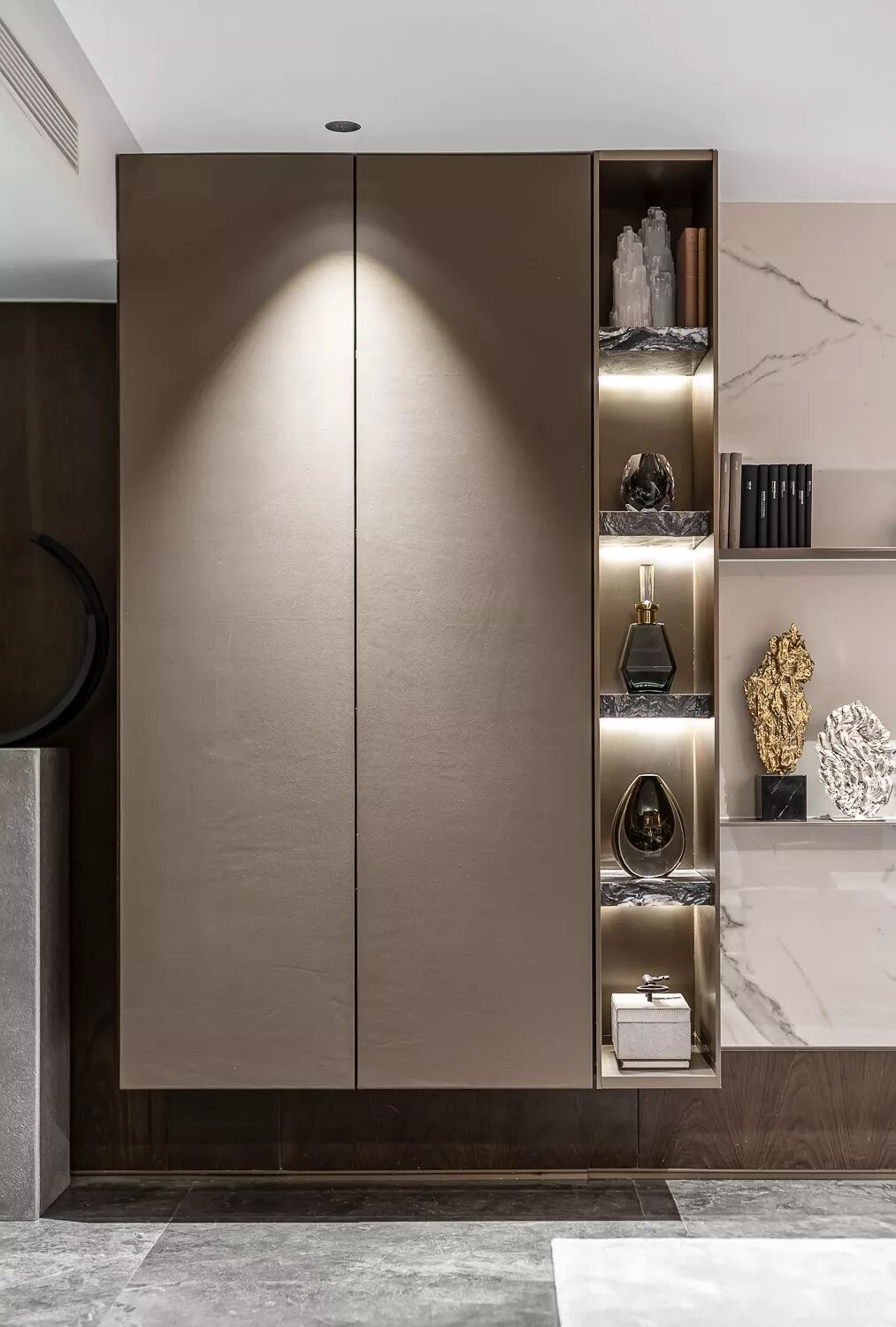 空间主要以暖色调为主,通过黄铜、木头、大理石等材质,搭配出既具自然风味又存现代精致的设计,平衡生活的美。