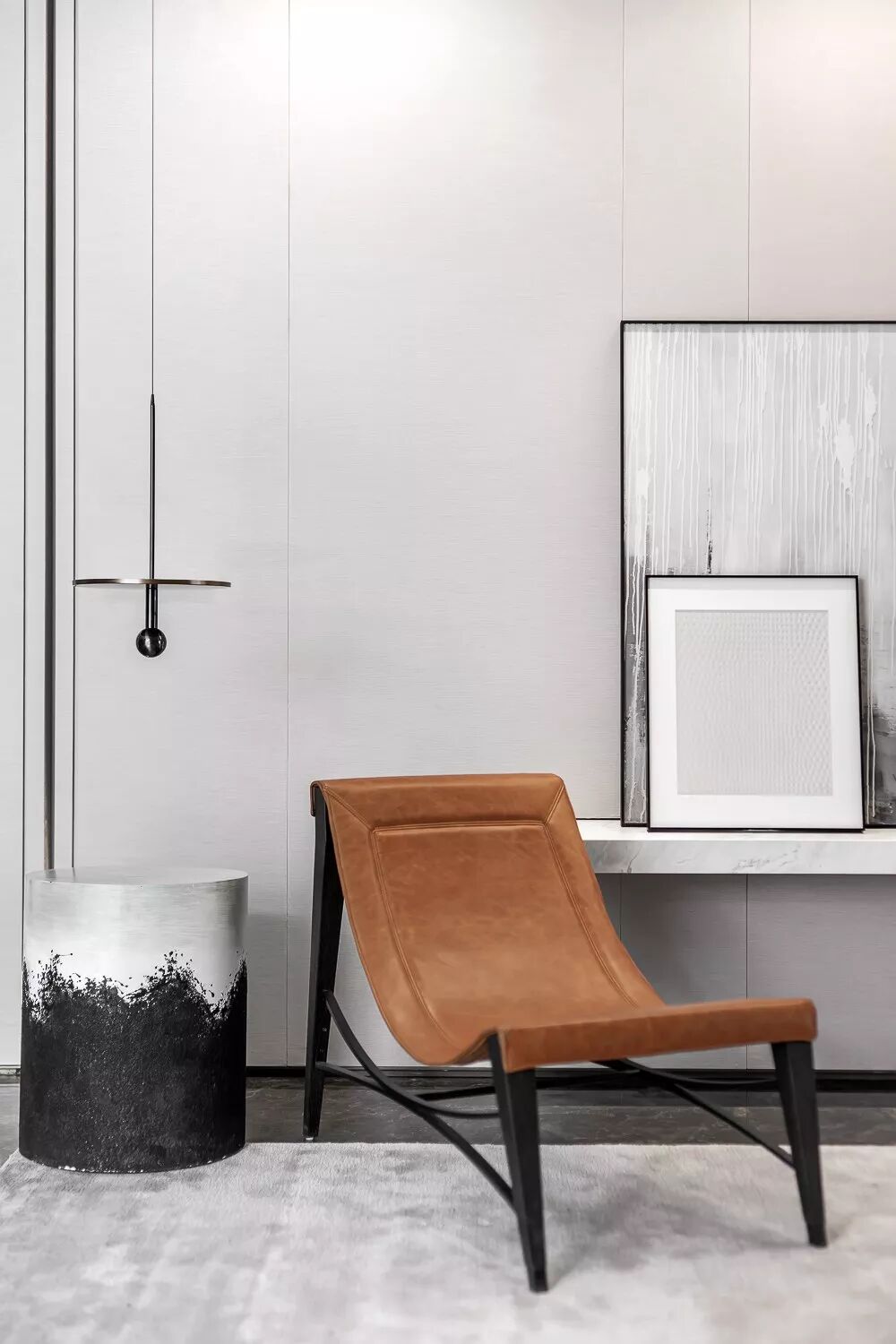 低饱和色调墙面点缀黄铜边框呈现出高品质生活气息。兼顾实用性与舒适性的橙色皮质躺椅搭配灰色绒毛地毯,舒适的触感、清新的配色,塑造别样的居住美感。