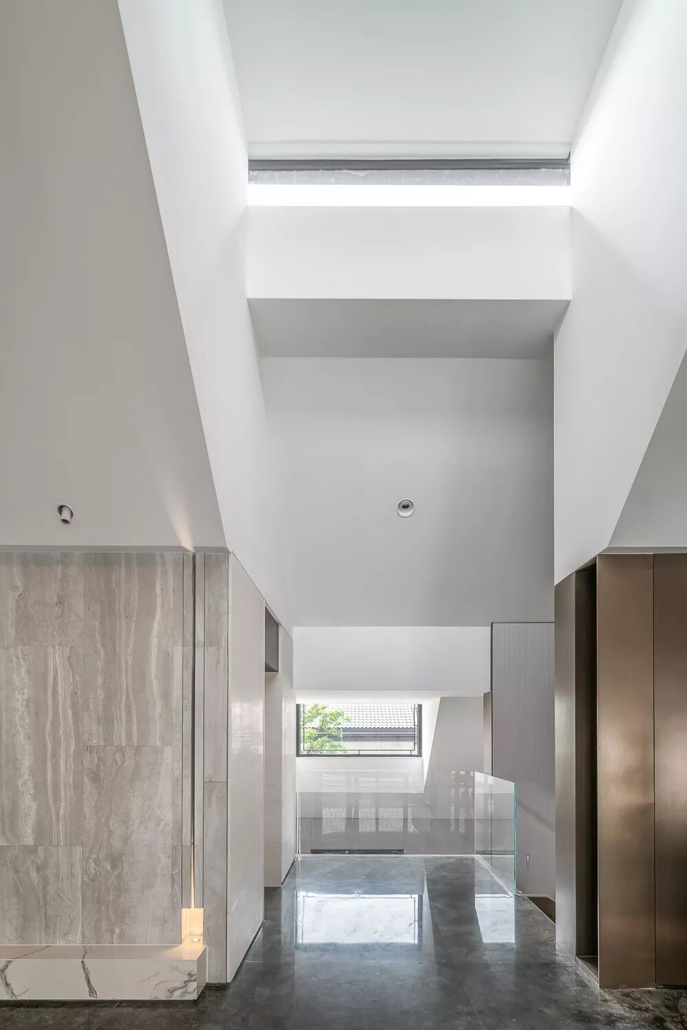 楼梯旁开合性更强的空间,连通室内与室外,引入了更多的自然光。空间纵横贯通,视野通透而开阔。