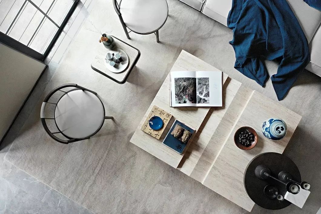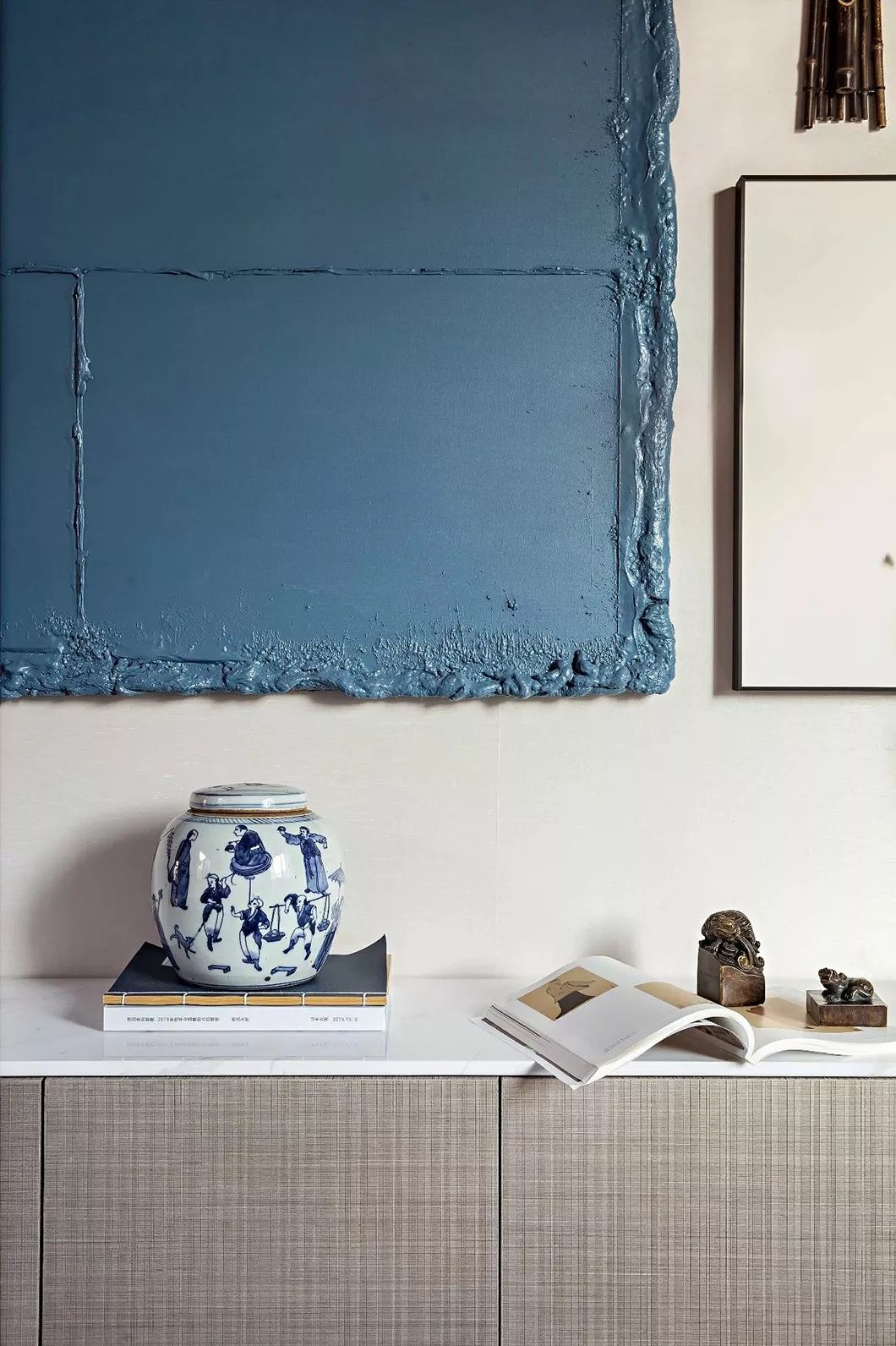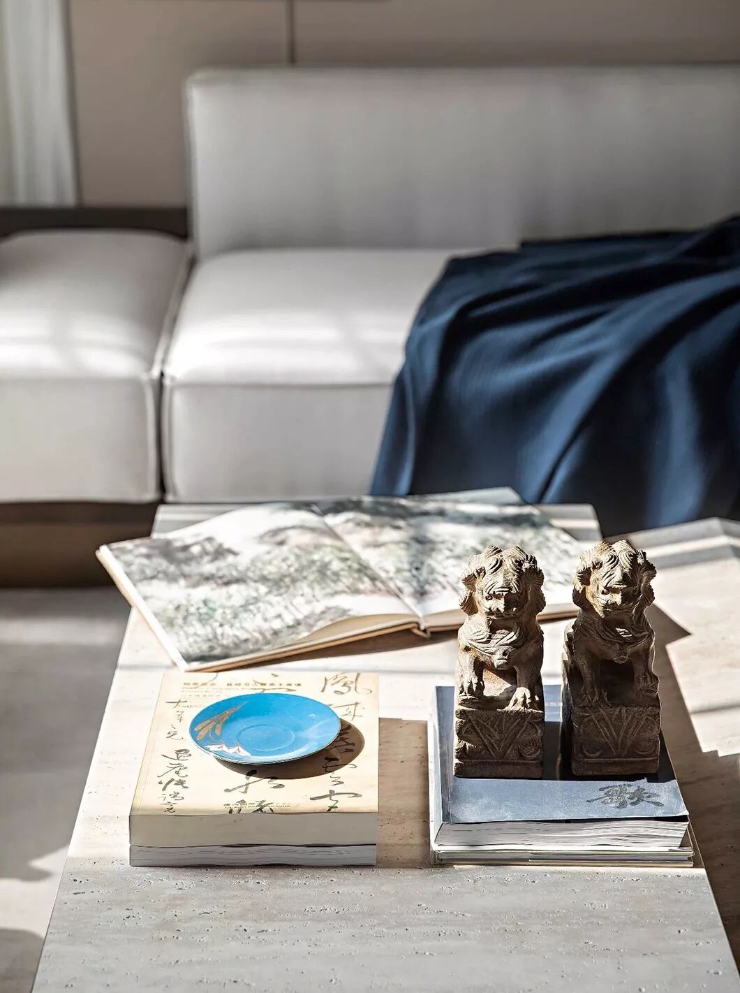 茶几上青花瓷器和其他蓝色摆件,汲取东方雅致意趣,将温婉优雅、精致极简暗藏于内,独领东方式美学风雅。