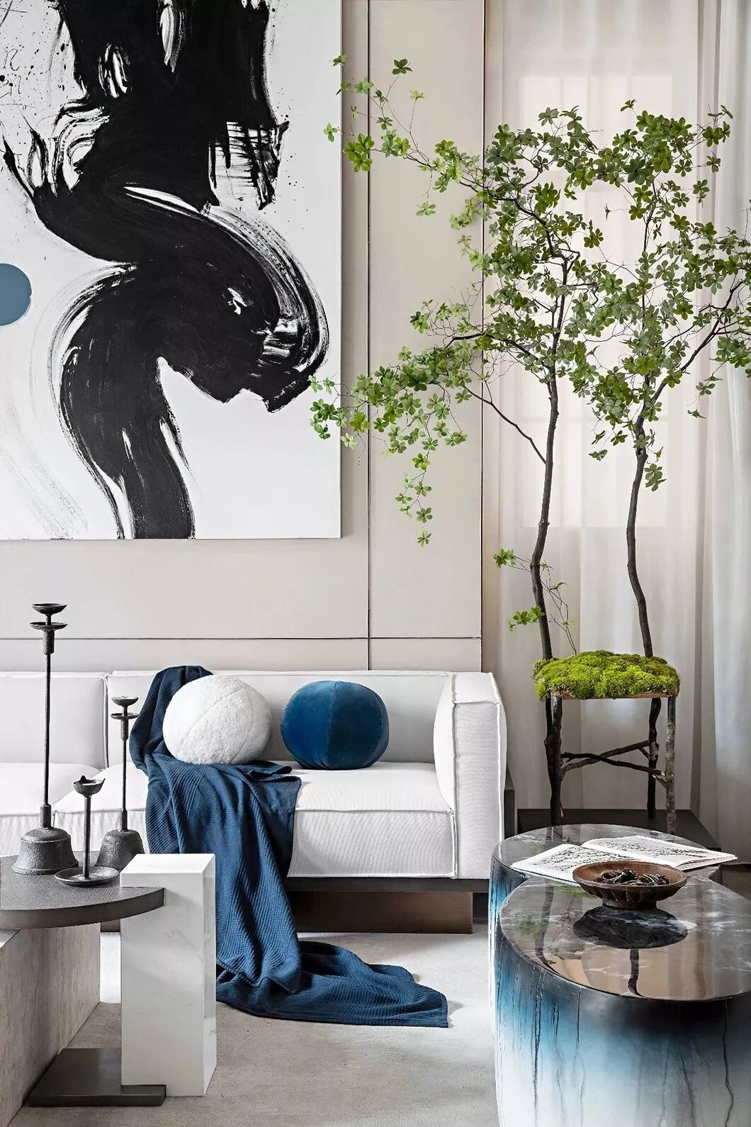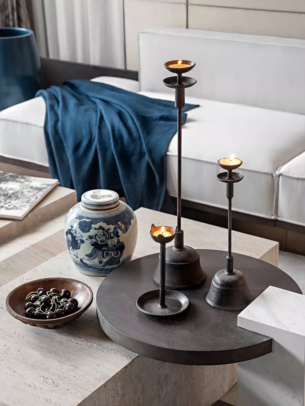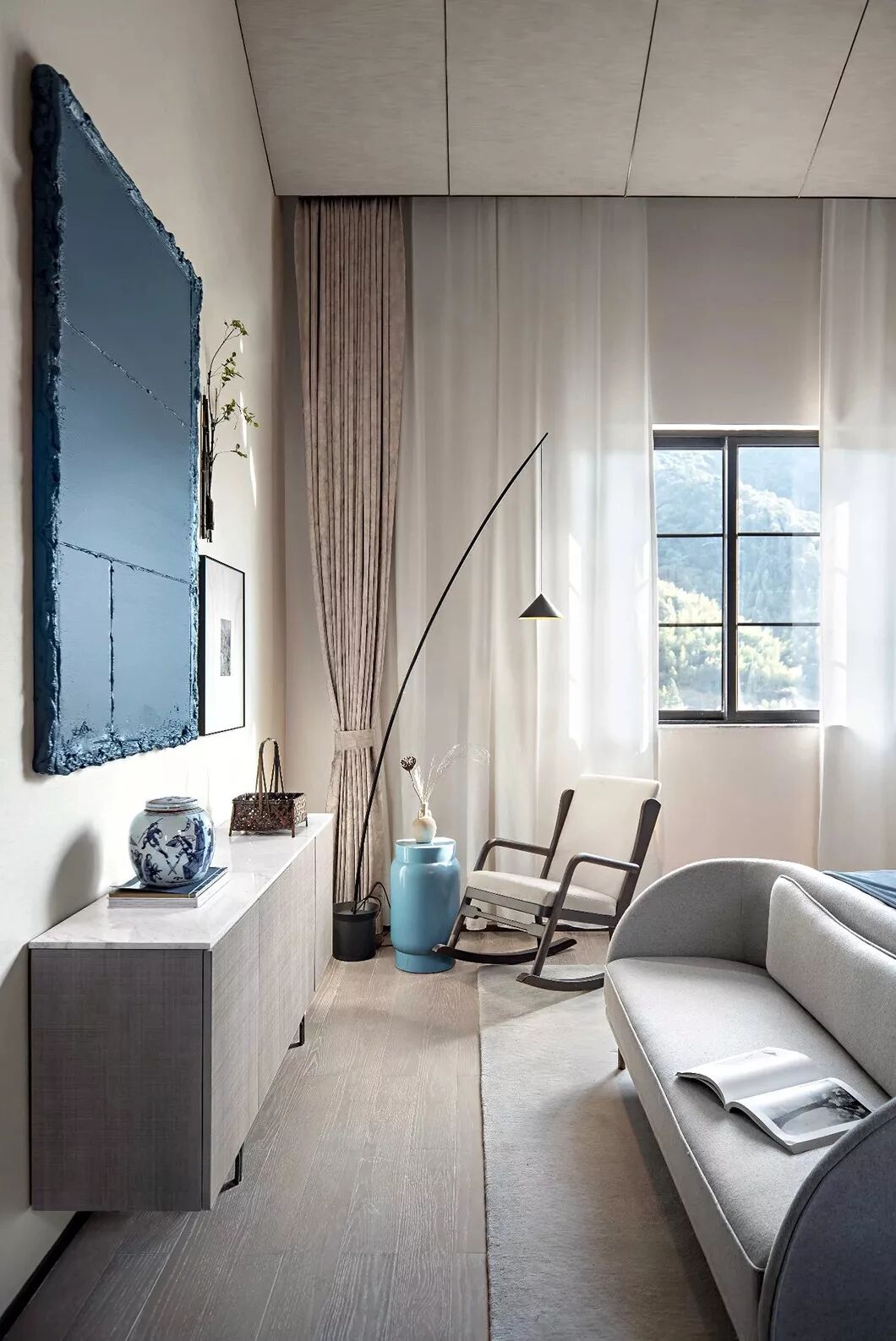 茶几上青花瓷器和其他蓝色摆件,汲取东方雅致意趣,将温婉优雅、精致极简暗藏于内,独领东方式美学风雅。