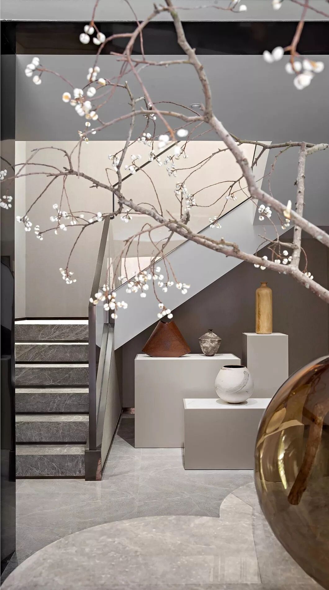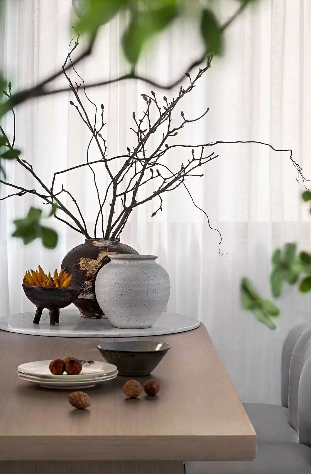 左侧花艺罐颜色深沉如墨,与灵动的花艺形成鲜明的对比,仿佛主人凭窗而望,将室外的一抹绿意蔓延于室内。