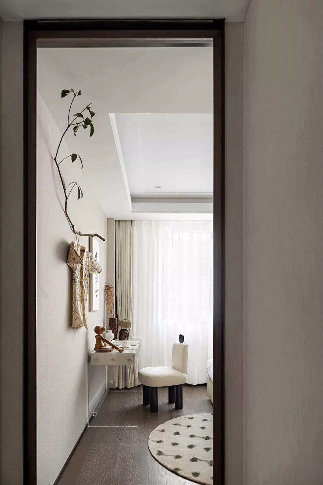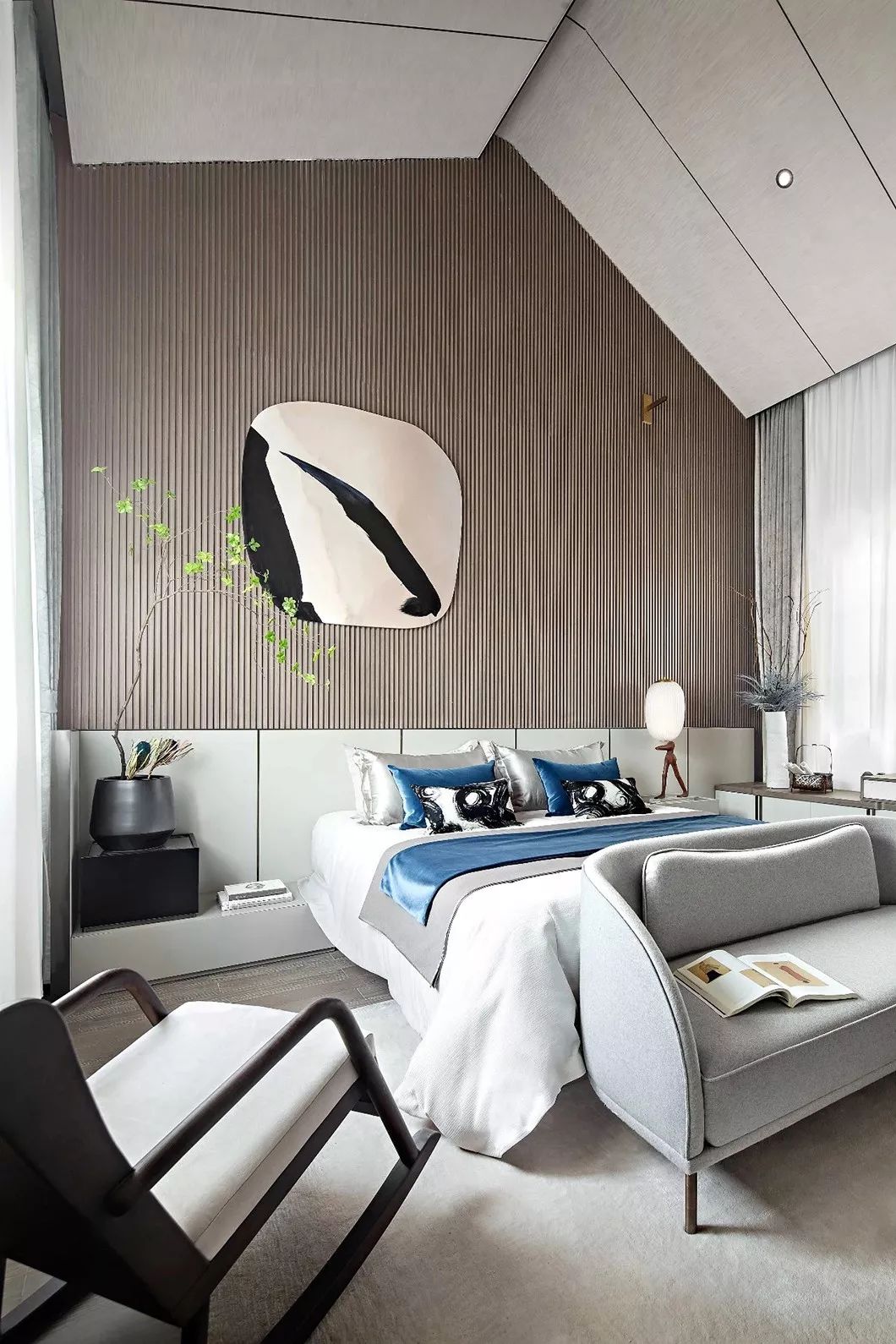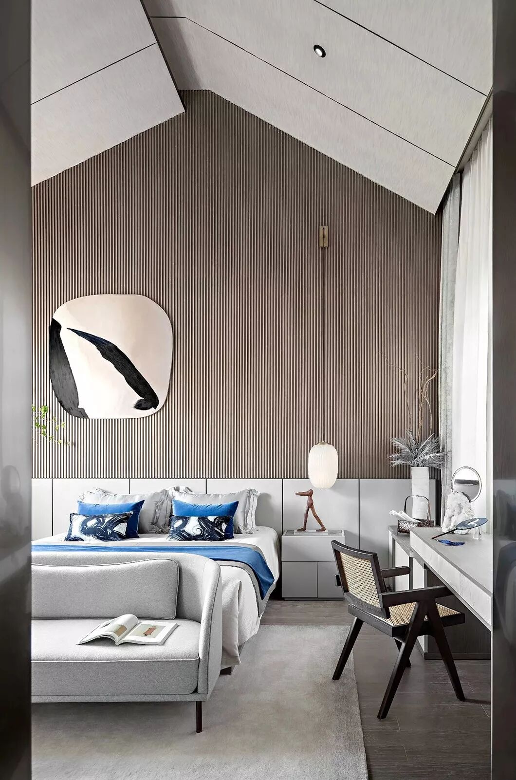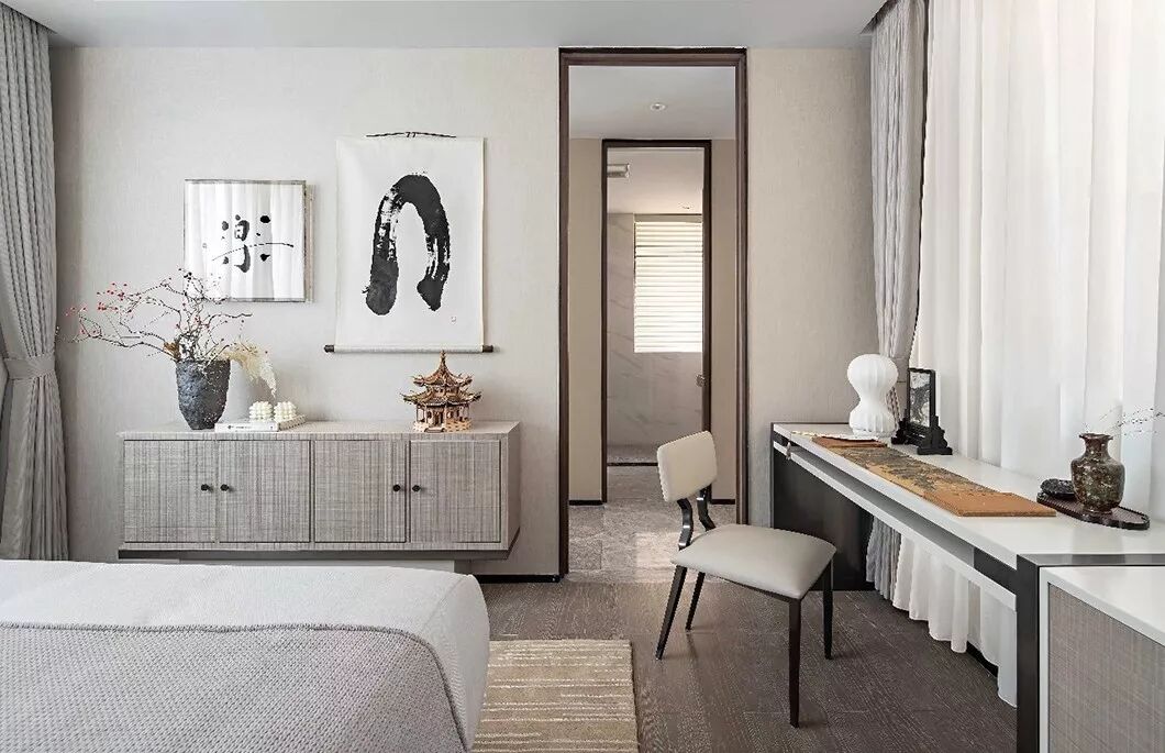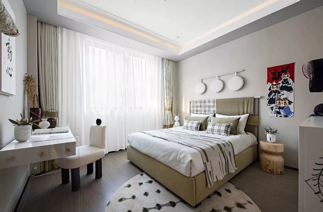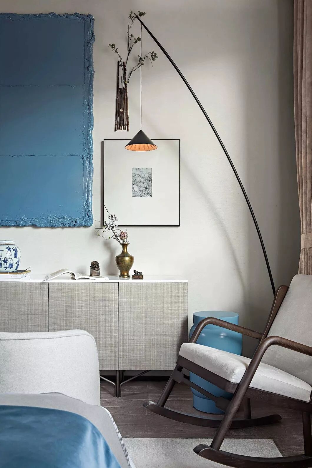 床对面的简约现代艺术画作,具有中式趣味的青花瓷器,以及精巧的小桌案,以点带面丰富了简约大气的卧房空间。辅以日式回流瓶、拓印和摇椅,勾勒出一幅主人借室内一番景色洗去一身浮躁,留一份安宁于内心,悠然自得的闲逸之心。