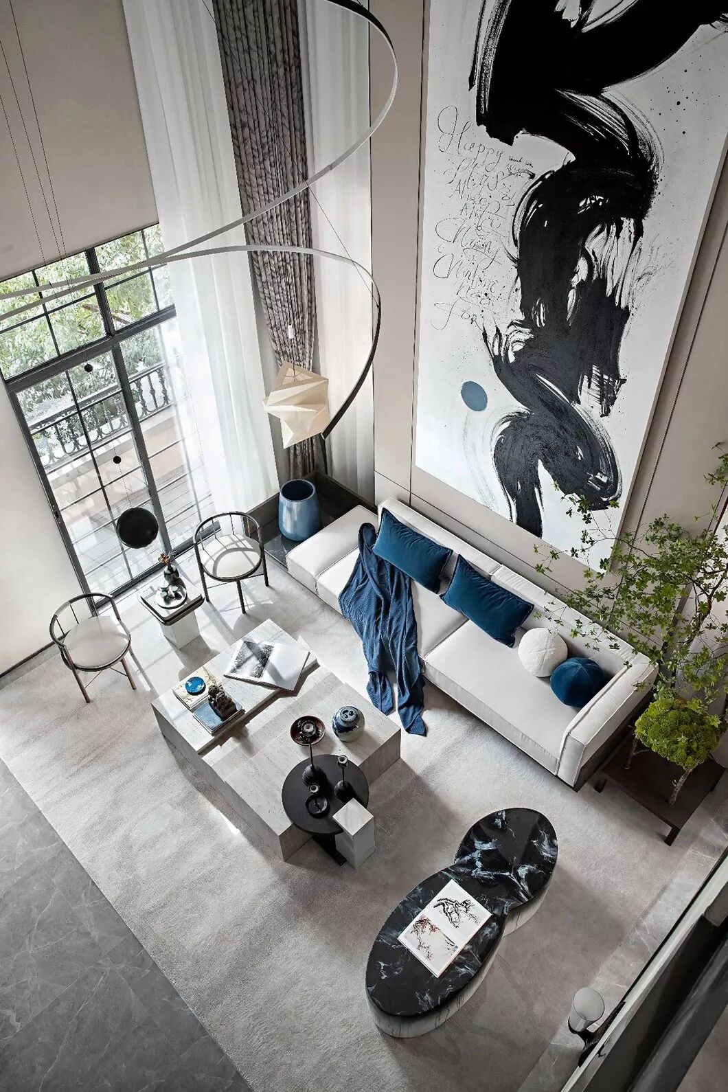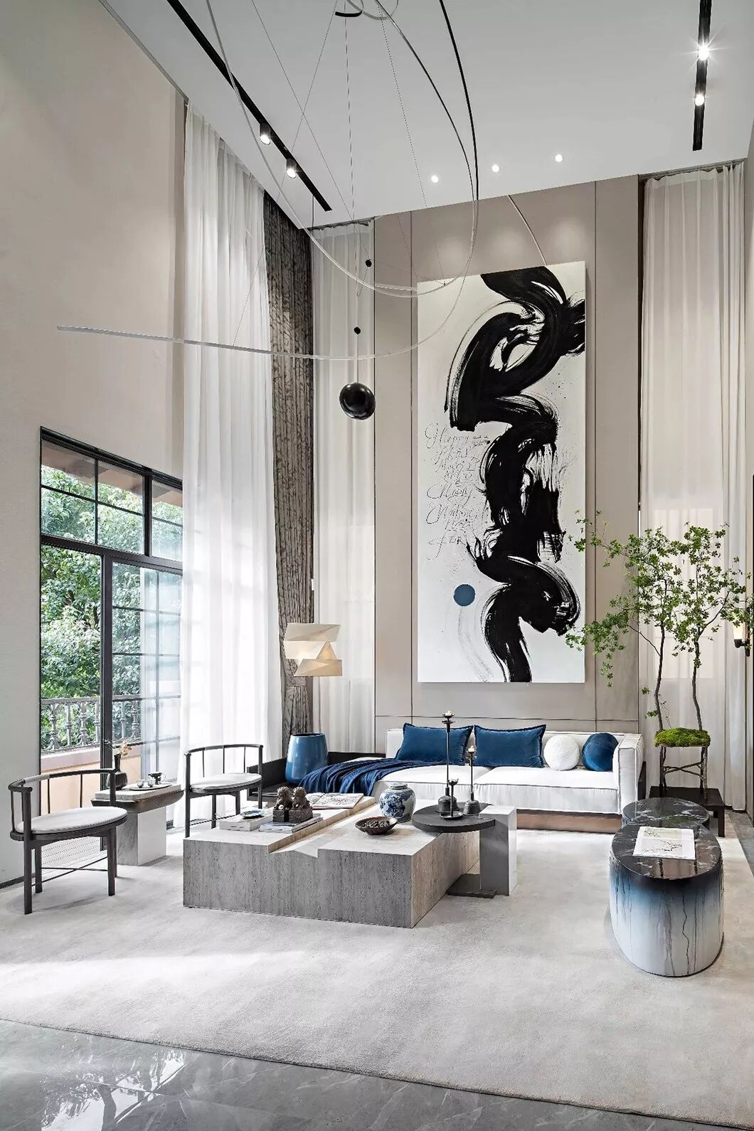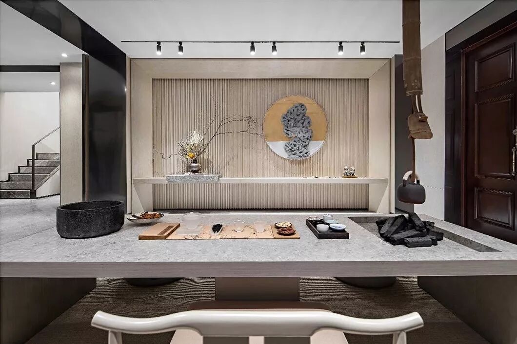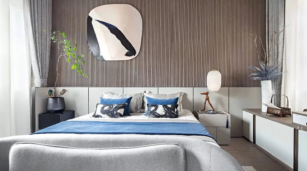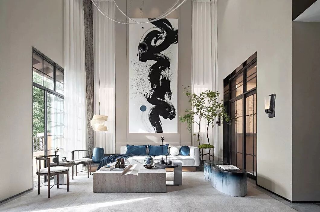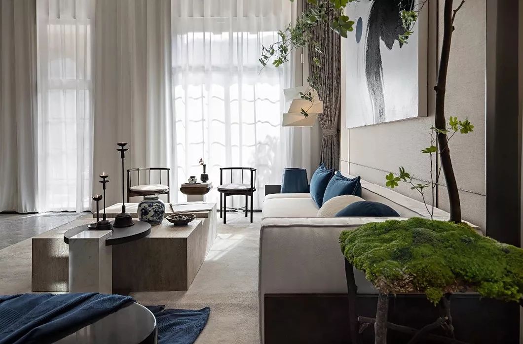 本案设计精心打造“山隐之下,悠然自得”的中式宜居环境,汲取现代独特前卫的审美意趣,融合中式传统文化精髓,运用多样化的设计手法,采用2020年年度流行色“经典蓝”和诸多艺术家作品,缔造一个优雅闲适,乐山乐水的“隐”居环境。
