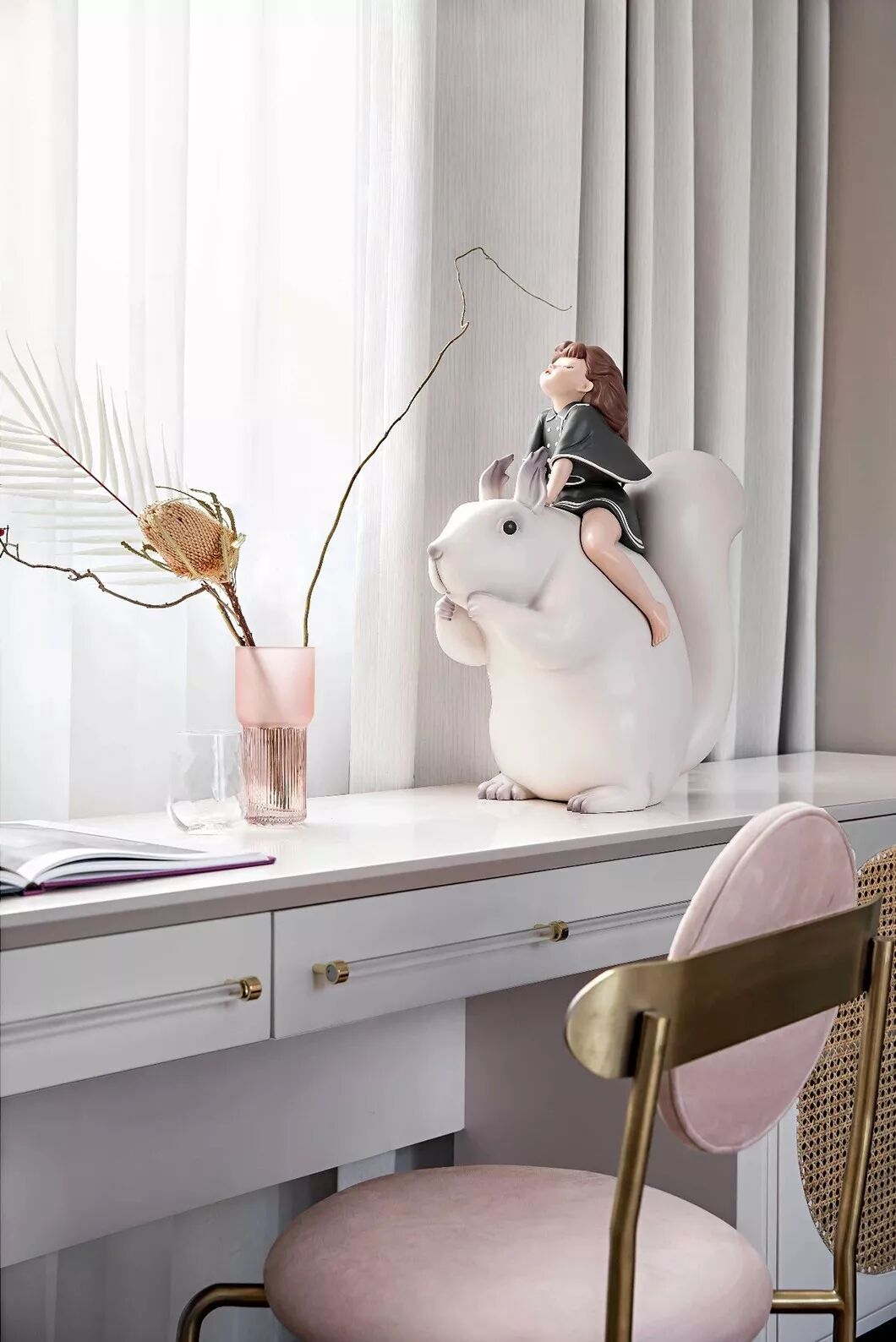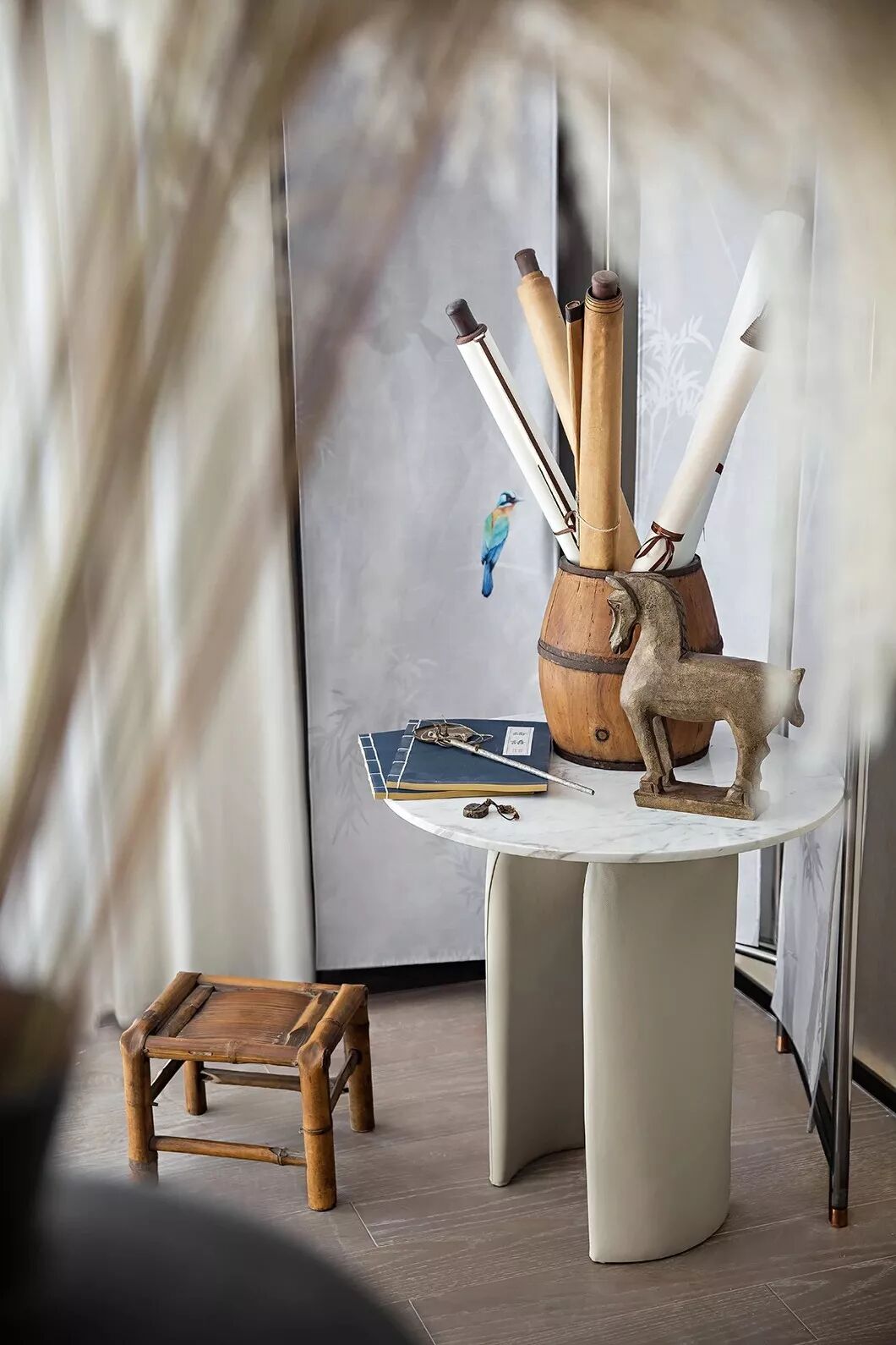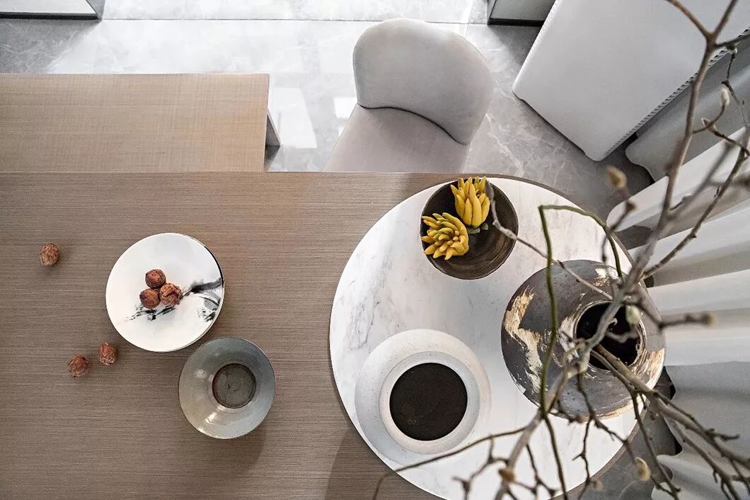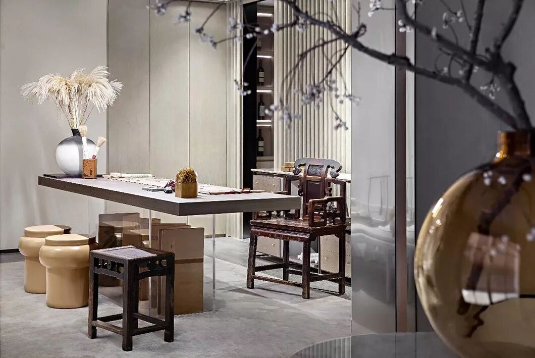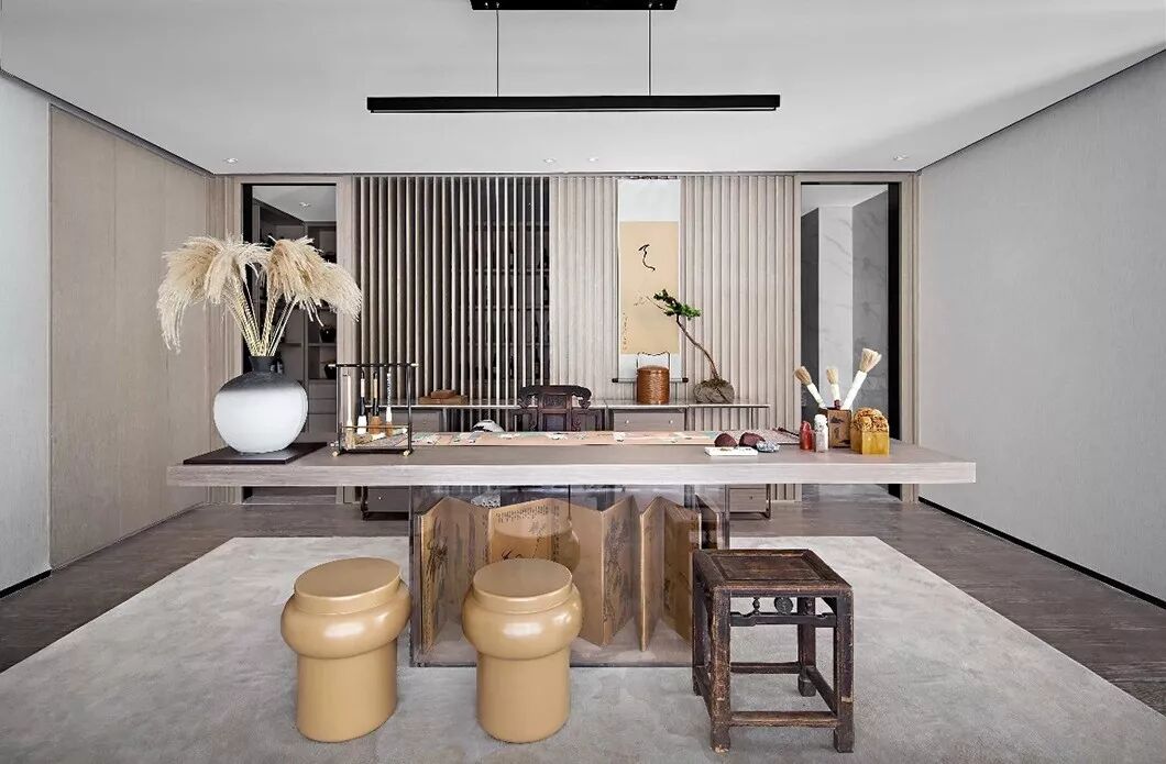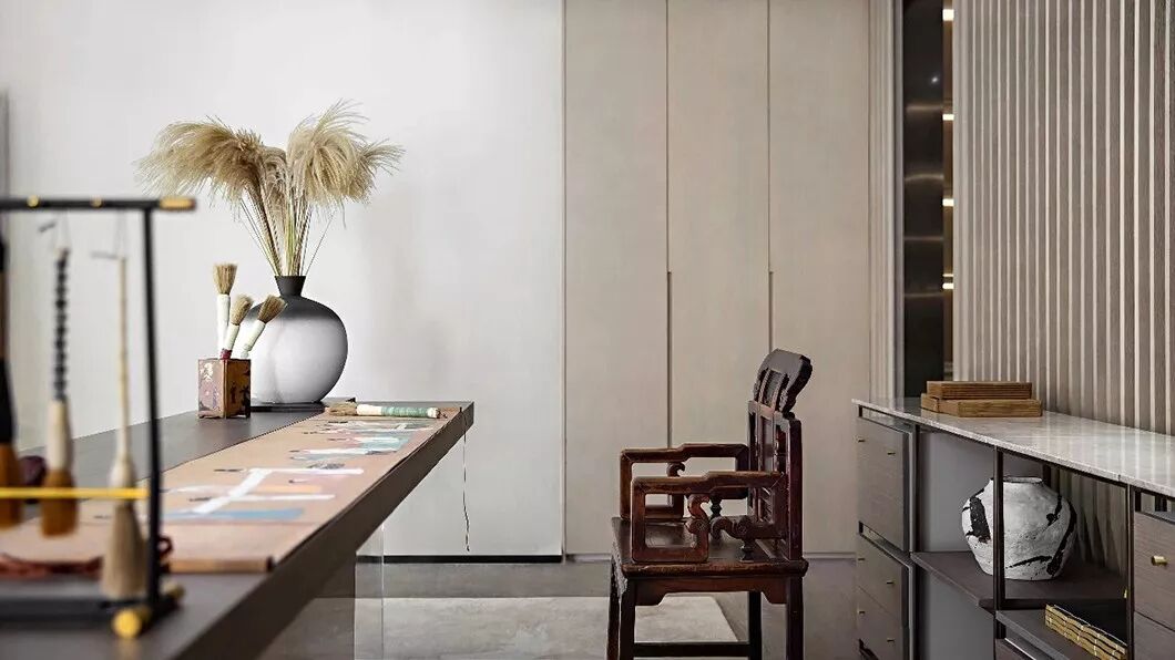 书画室以淡雅的杏牙黄为主色调,空间中的书桌以亚克力作底,摊开的画卷描摹了四季万物之色,气韵生动而不失大家风范。遥相呼应的是两个桌前圆木凳与背后的卷轴画。桌边左侧的黑白墨色花瓶与芦苇的搭配也更添野趣与闲适。
