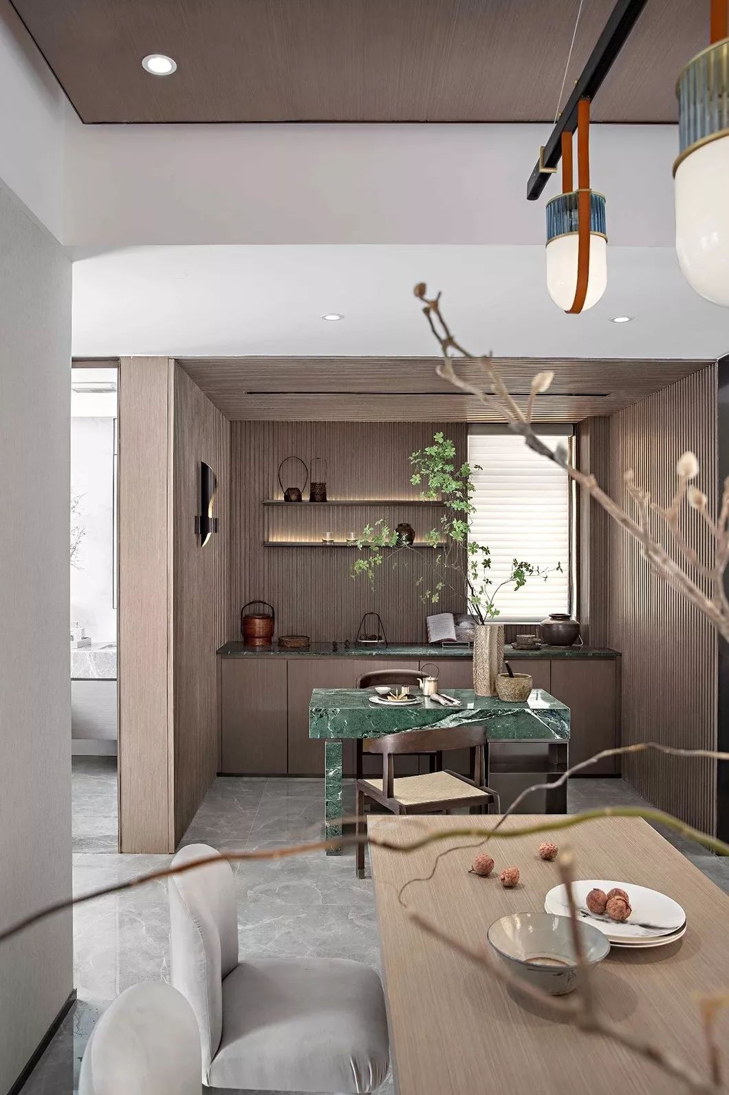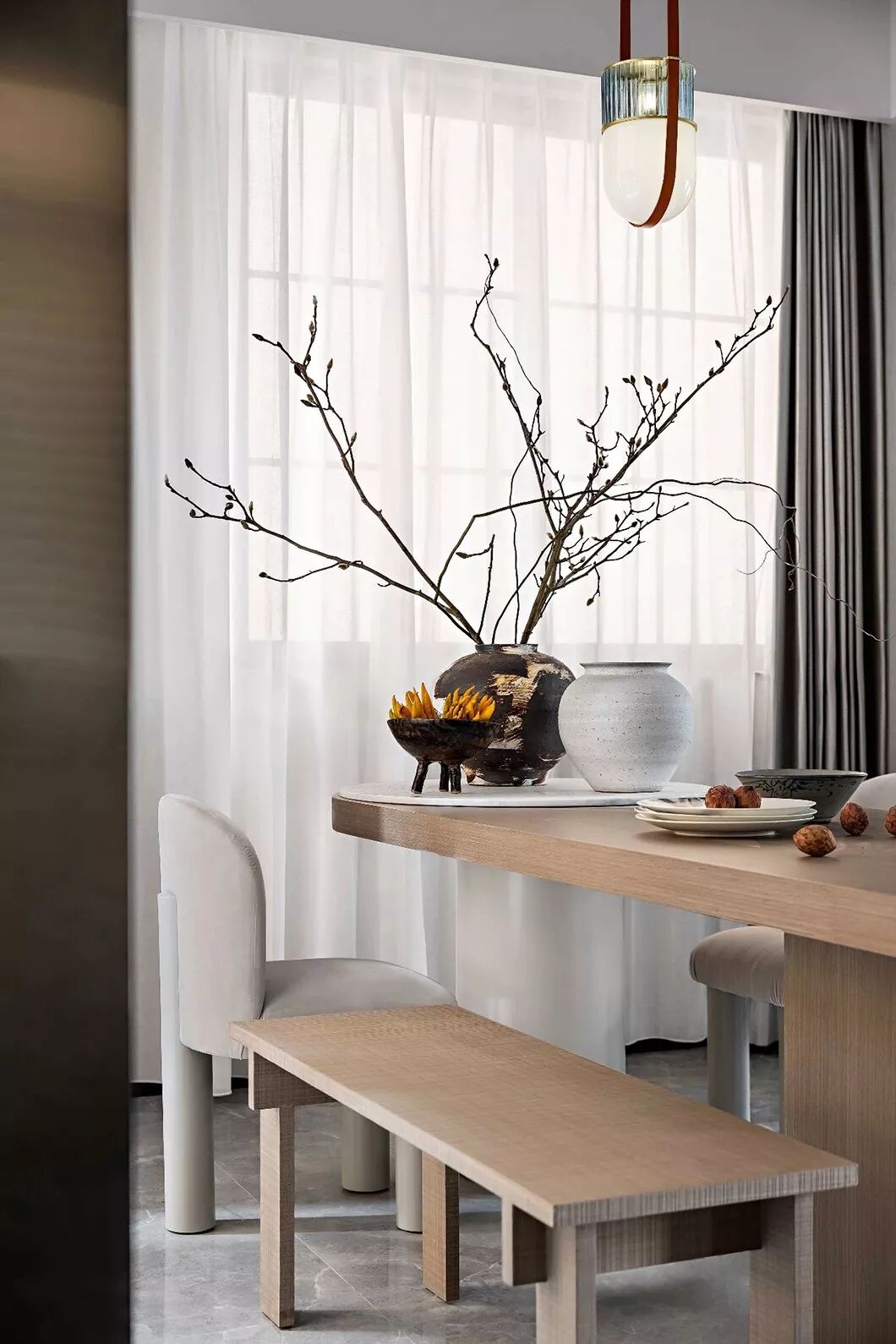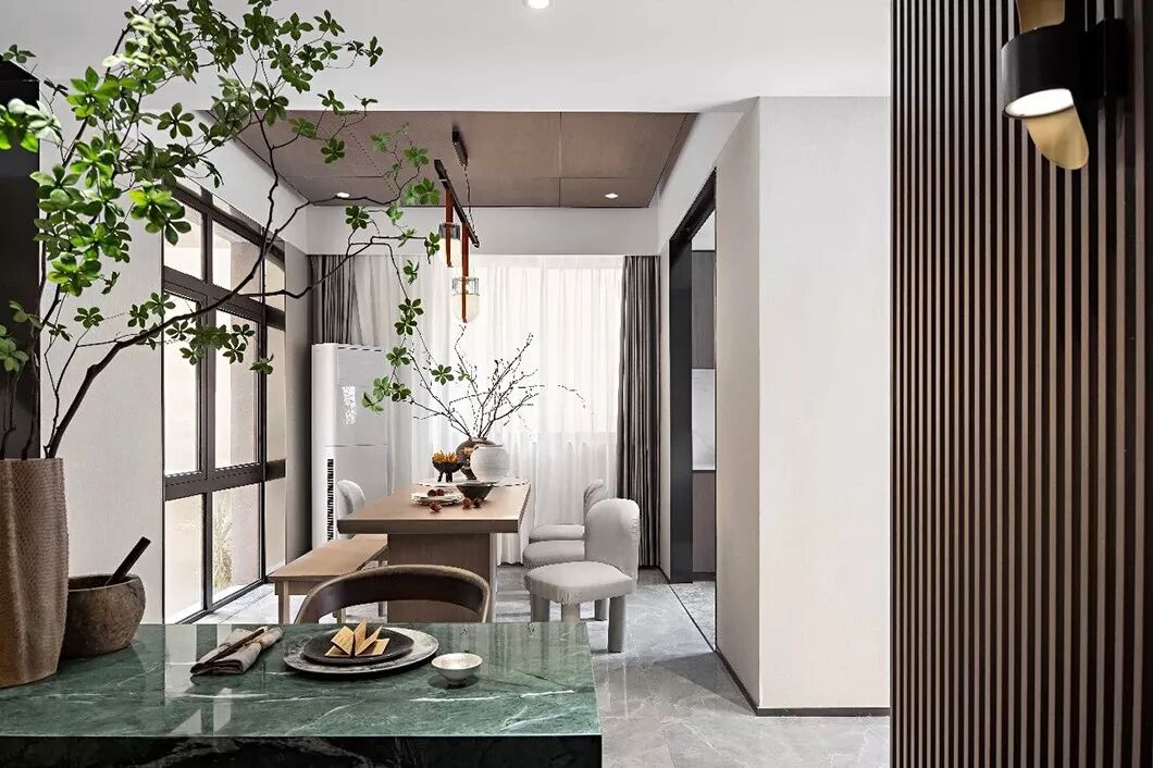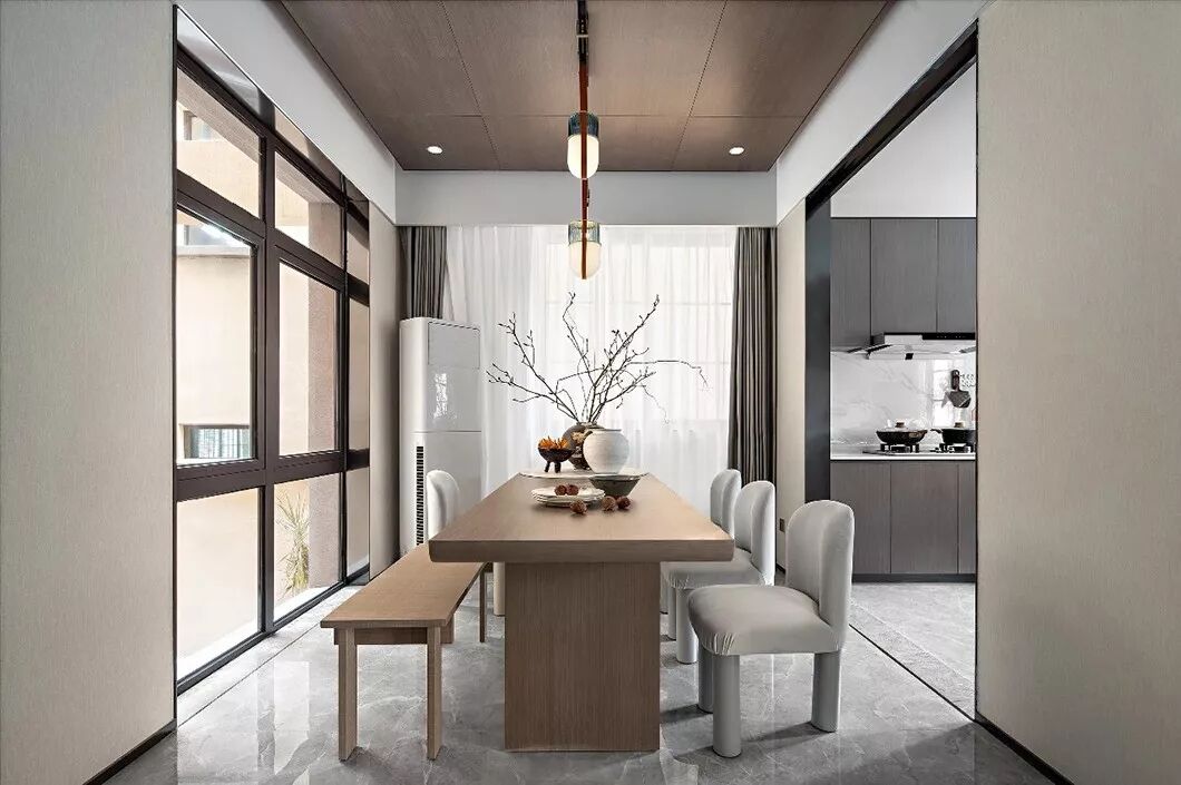 餐厅空间与西厨岛台相邻,原木色餐桌与灰色绒布餐椅满足主人会友宴请宾客:日常早春,友人,清茶,几盘时令鲜菜,人间有味是清欢。