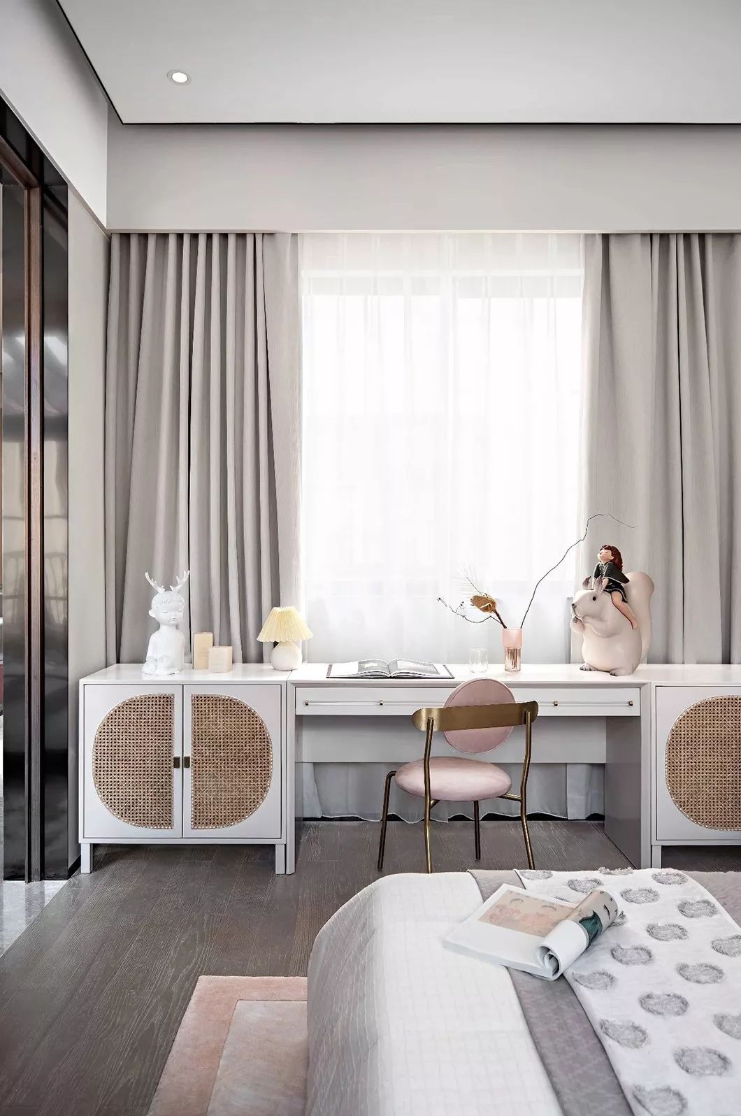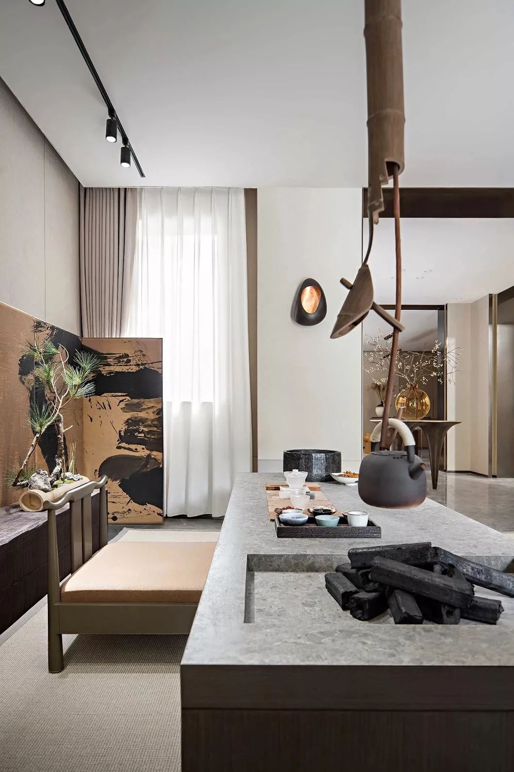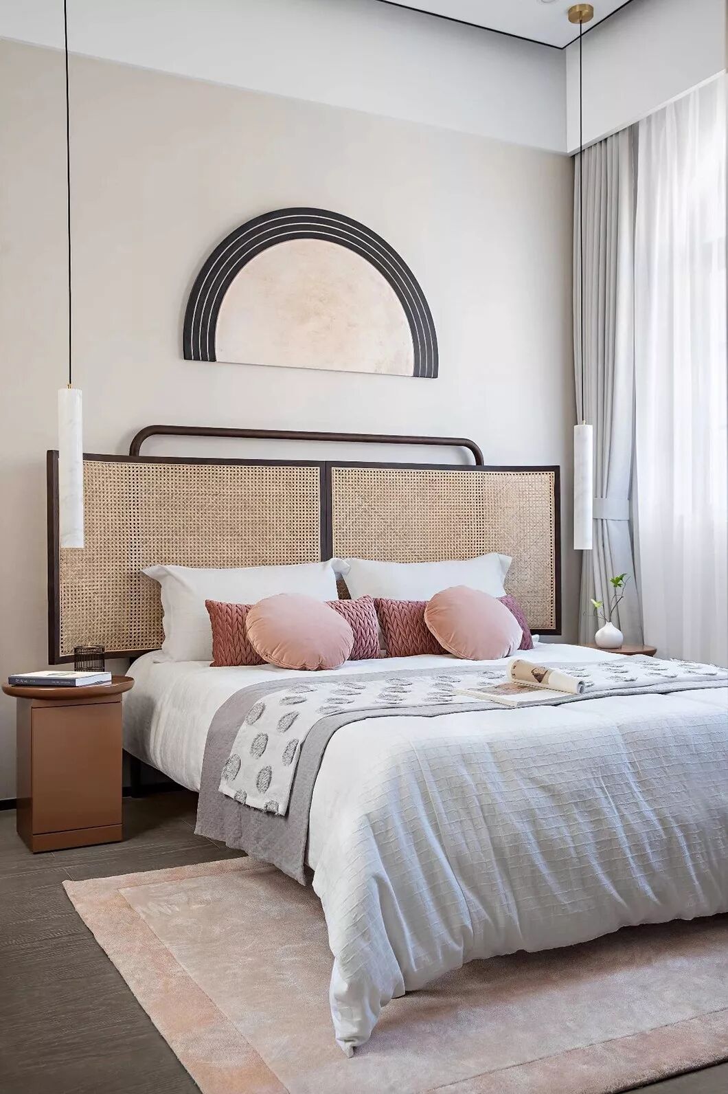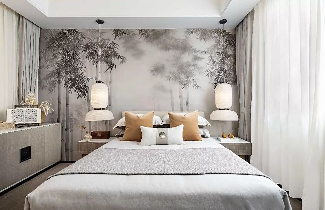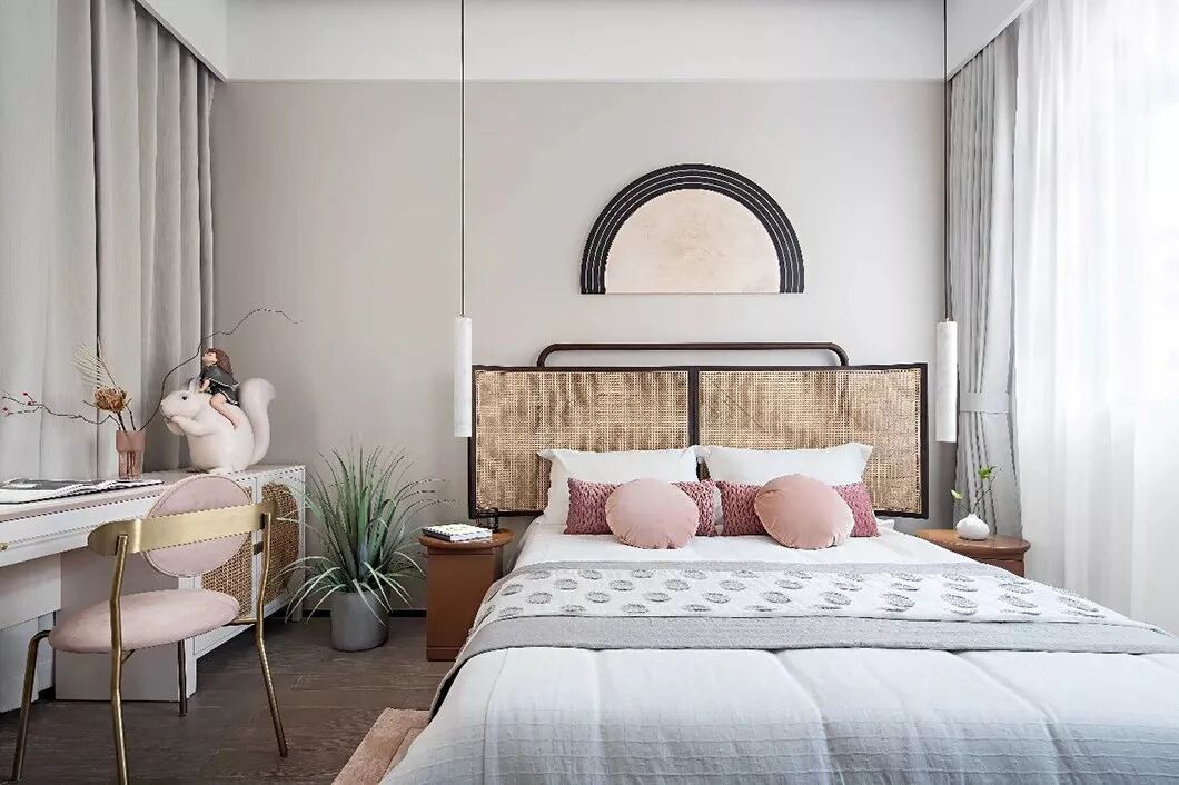 床背板上的挂画如皓月当空,而靠窗一侧的盆栽则描摹出“明月松间照”的画面来。床榻周围有轩窗对镜,工艺考究的琉璃夜灯,手工藤编收纳篮及刺绣团扇,琉璃吊灯补足了较暗端的光线,近窗的那端则可“收四时之烂漫”。