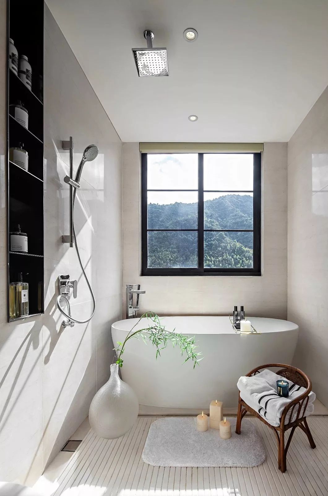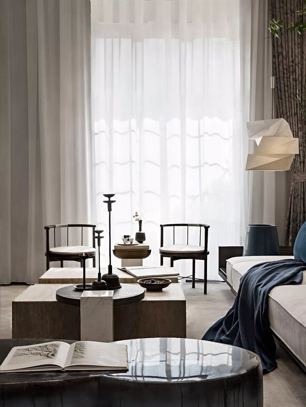 在日光交错中的敦实拓印和其下微微着尘的卷帙,连同月色下微光摇曳的古老烛台,也着力再现起居空间的中式典雅和考究。