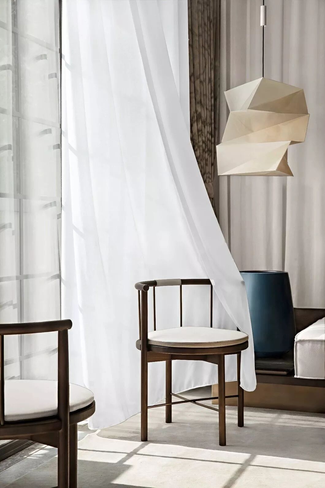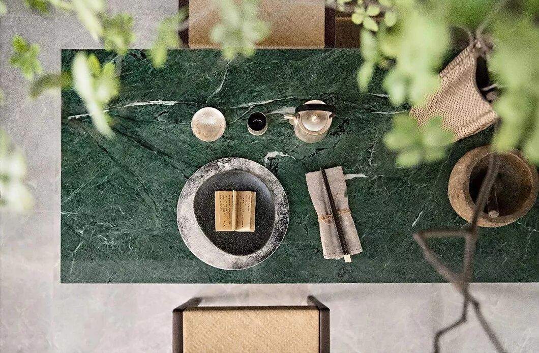 空间色以2020年流行的经典“蓝”作为主题色,在情感和心理的角度上,蓝色能让人感觉平静和可靠,让人产生信赖感,在中式意蕴中重新赋予经典蓝丰富的现代涵义。