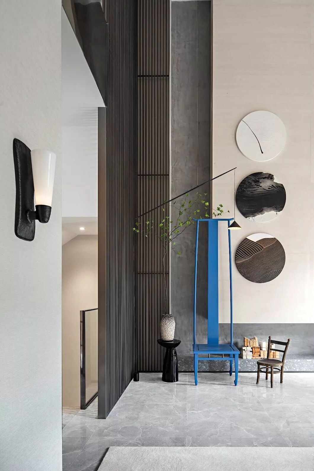 远处,蓝色的灯挂椅,形成尺度上的视觉中心,旧时寓意“步步高升”的老物件,被设计师披上流行的色彩,新与旧的对比成为独特的艺术风格。