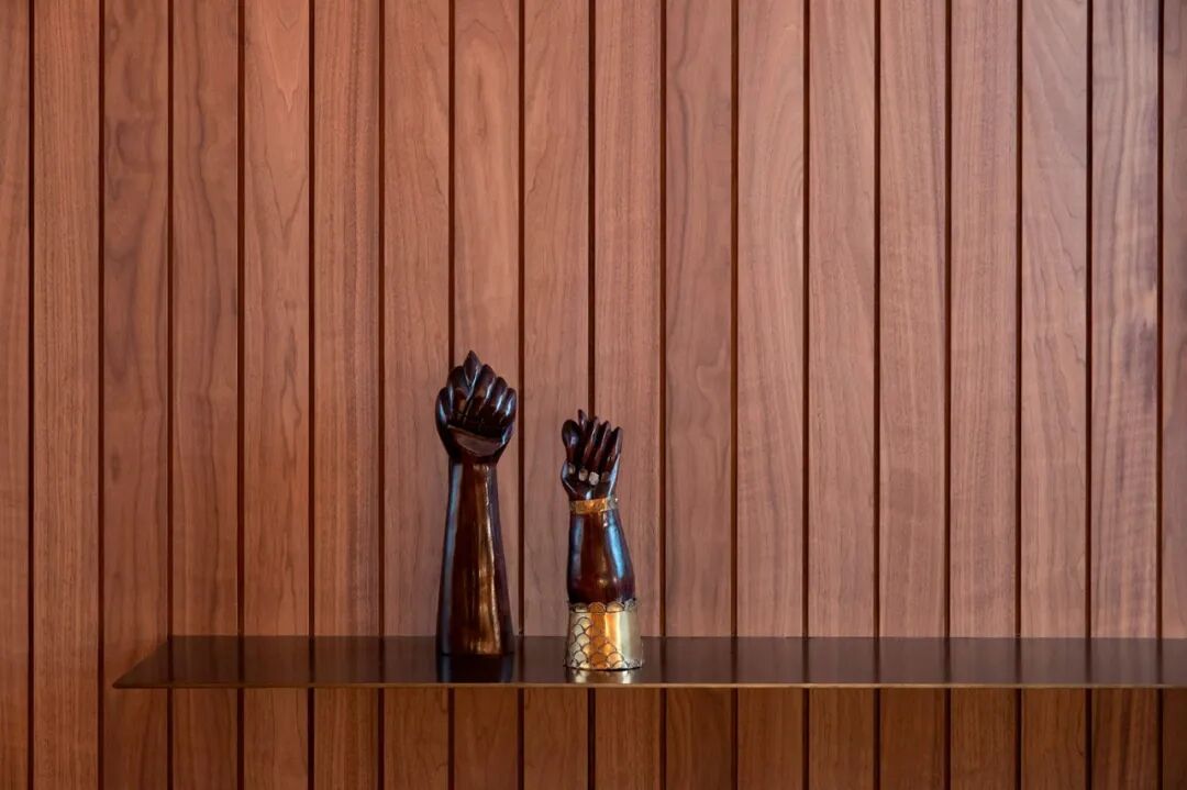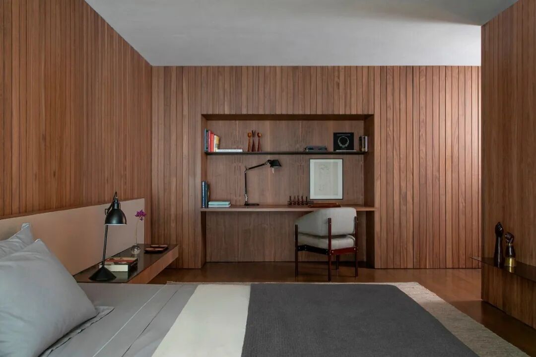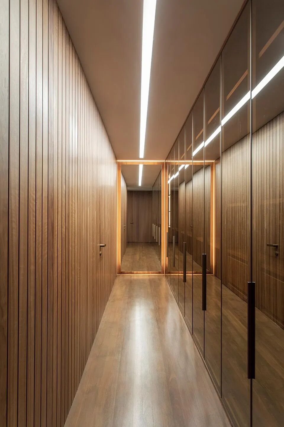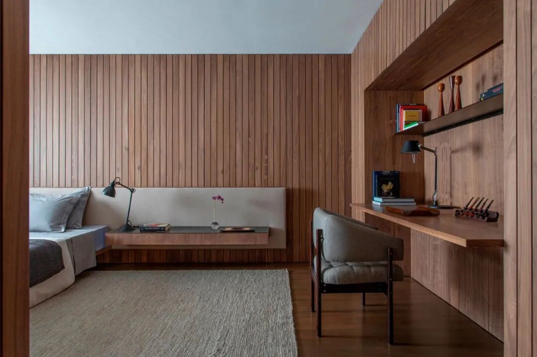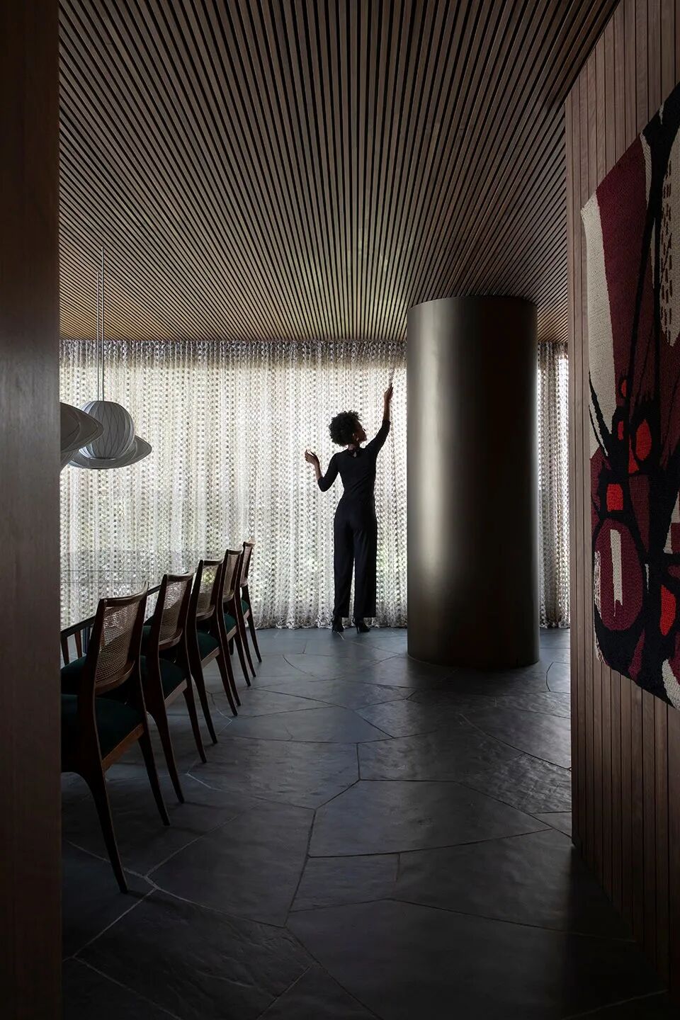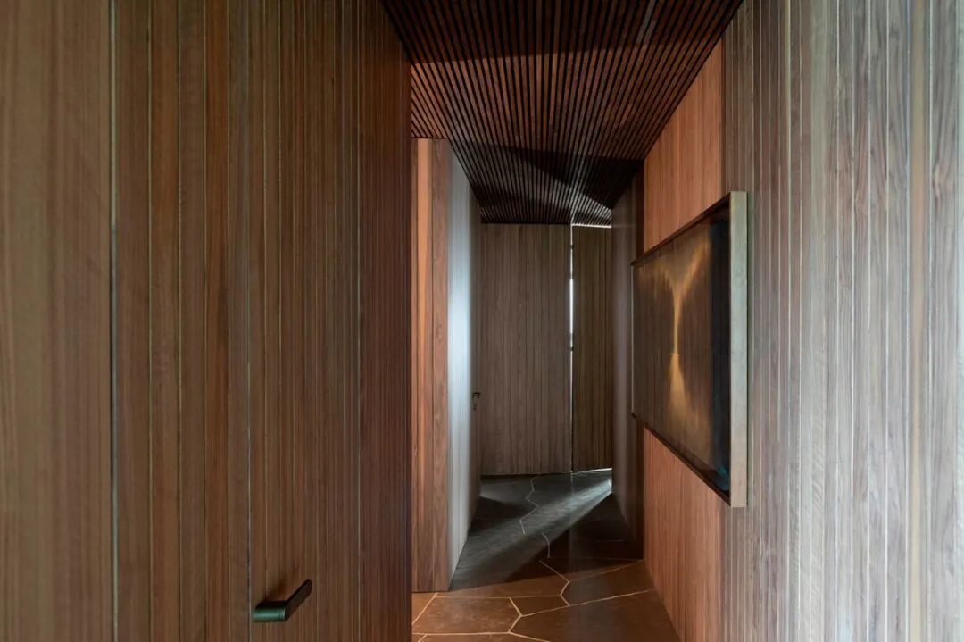 设计团队使用天然材料,如碎石板地板、木条天花板和胡桃木墙面等,在公寓中营造出一种舒适的氛围。