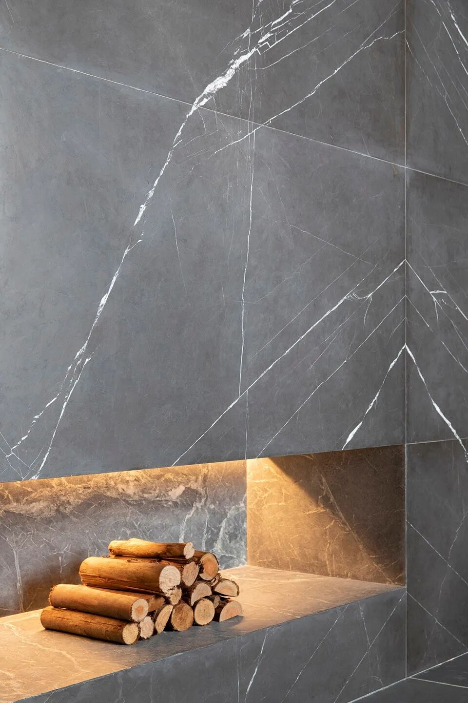 落地窗对面墙壁上的置物架单元和大理石壁炉将社交空间与私人空间分隔开来。