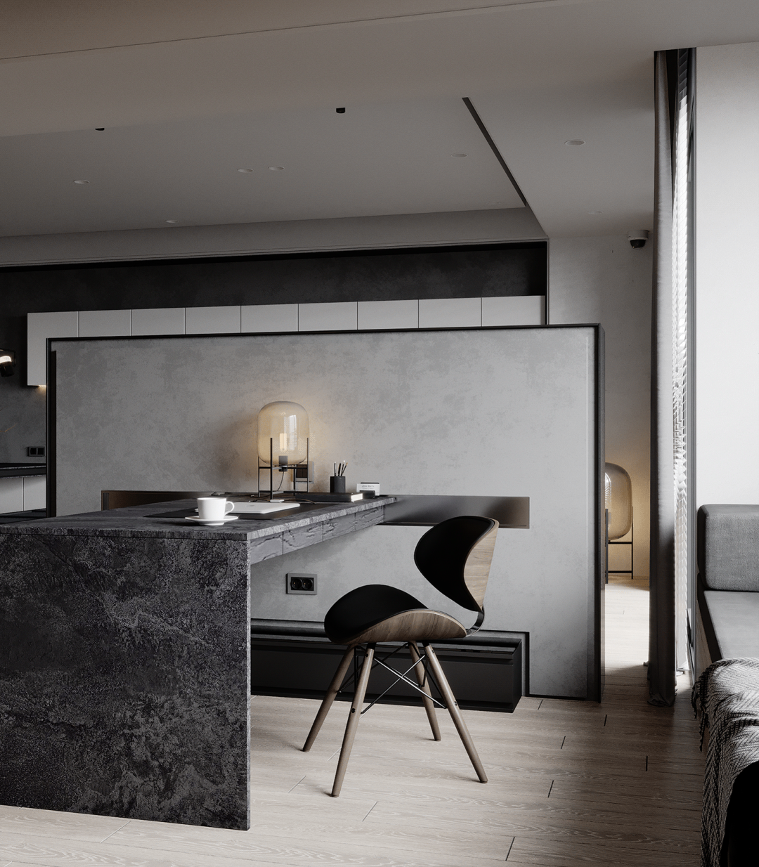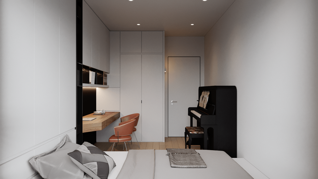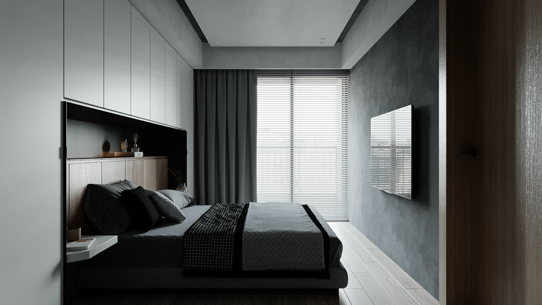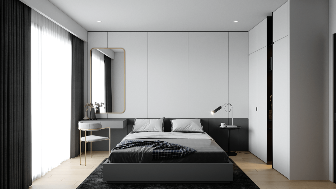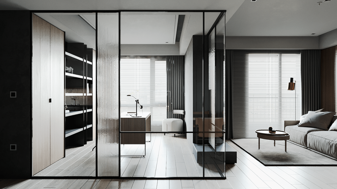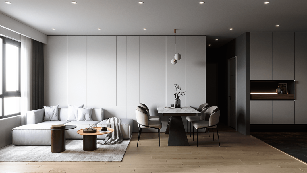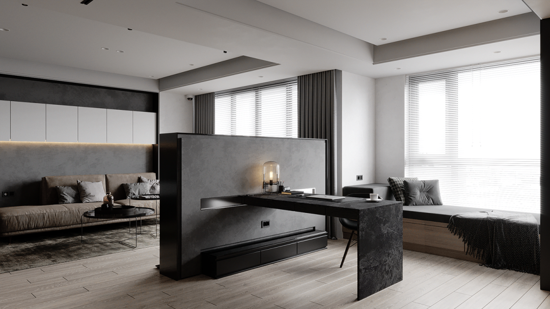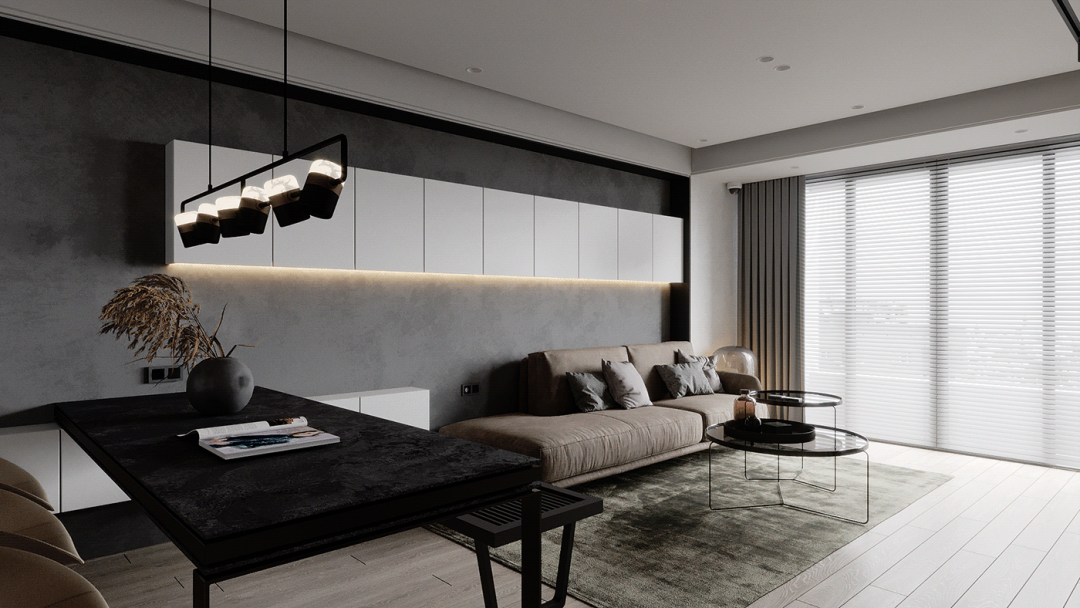 客厅的设计给人的第一印象是很简约的,大白色的空间主色调,大大的落地窗门,用了暗深灰色的窗帘,正好与室内的灰色相映衬。
