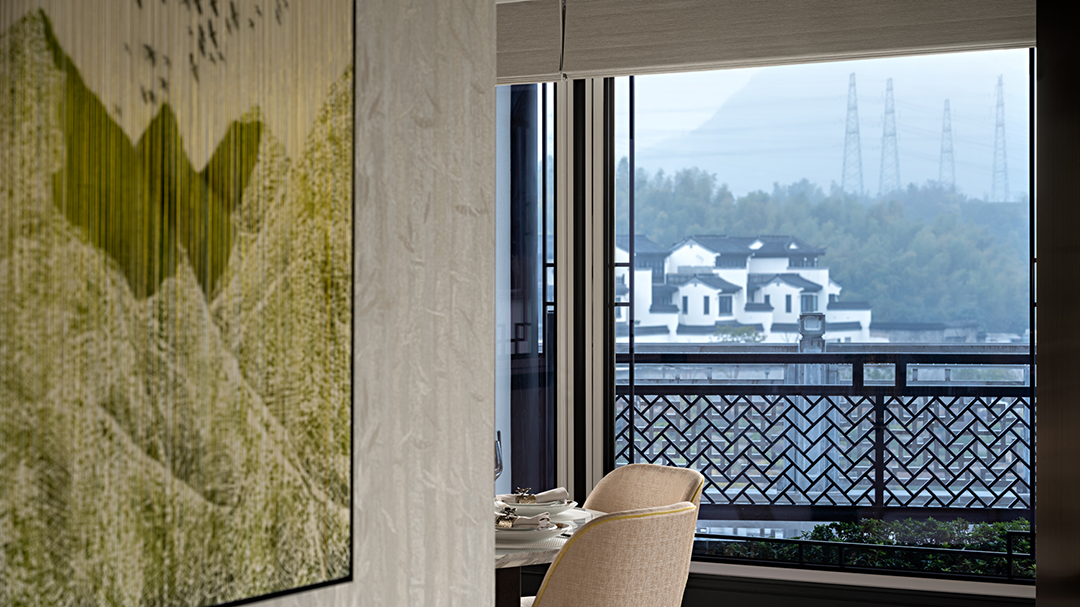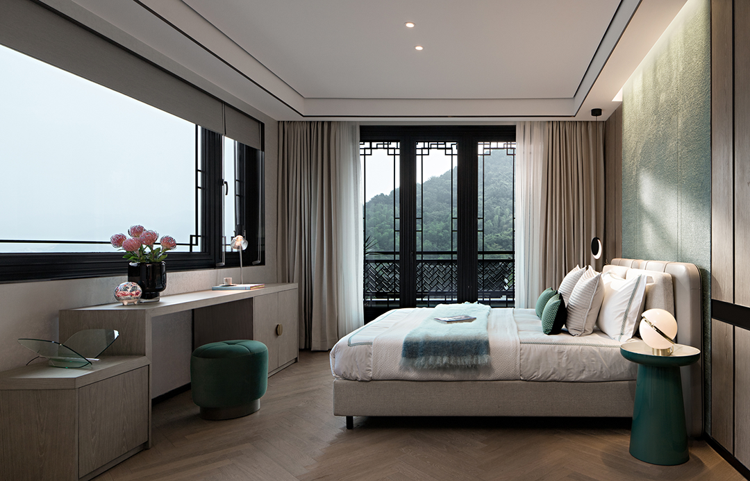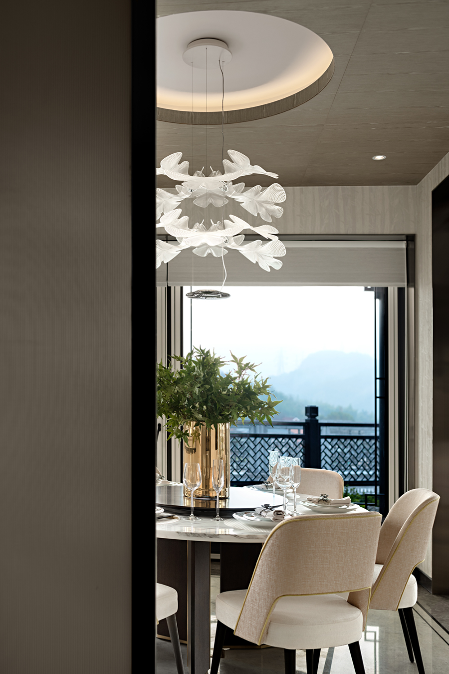 客厅中青山艺术画充分表达平静自在的心境,“峡里谁知有人事,世中遥望空云山。”从客厅的落地窗向远处眺望,天空澄碧、纤云不染,远山含黛、和风送暖。画与景融为一体、美轮美奂。