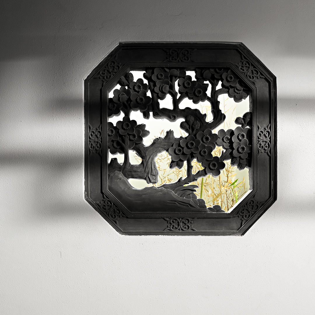 “小桃灼灼柳鬖鬖,春色满江南” 黄庭坚的《诉衷情·小桃灼灼柳鬖鬖》则讲述了茶室的艺术装置的故事场景,当户外的光影柔和的洒进室内,人们在进入这个空间的第一时刻于光影的变幻中感受到古雅清秀的格调氛围。