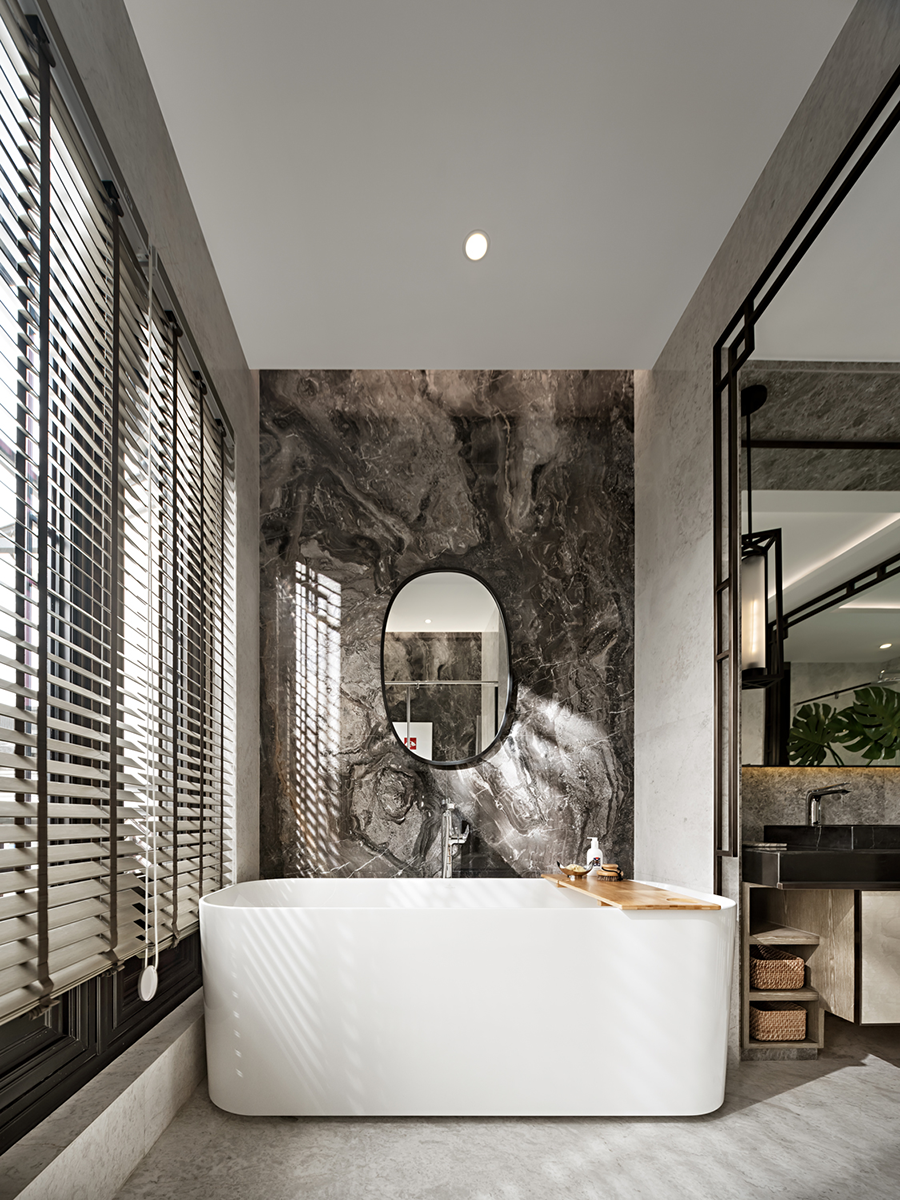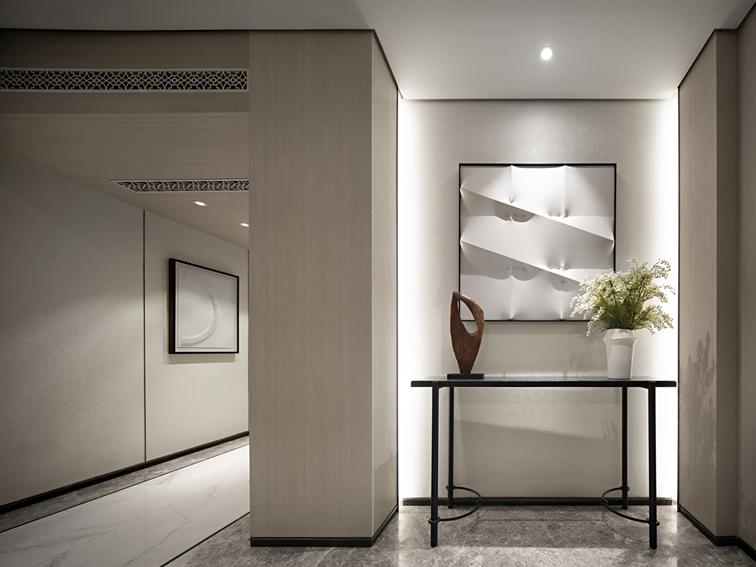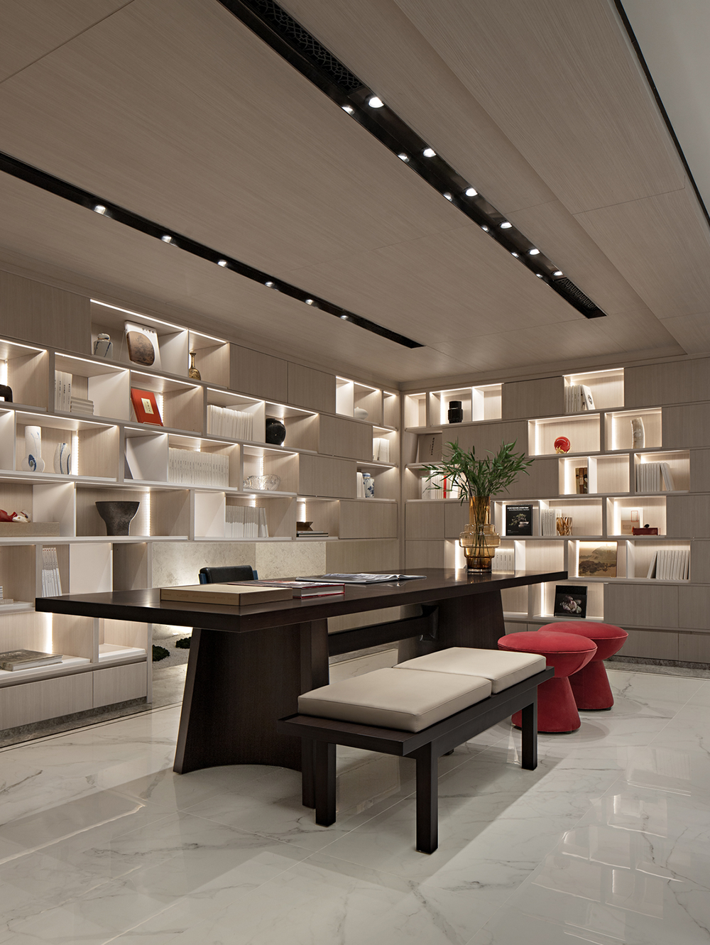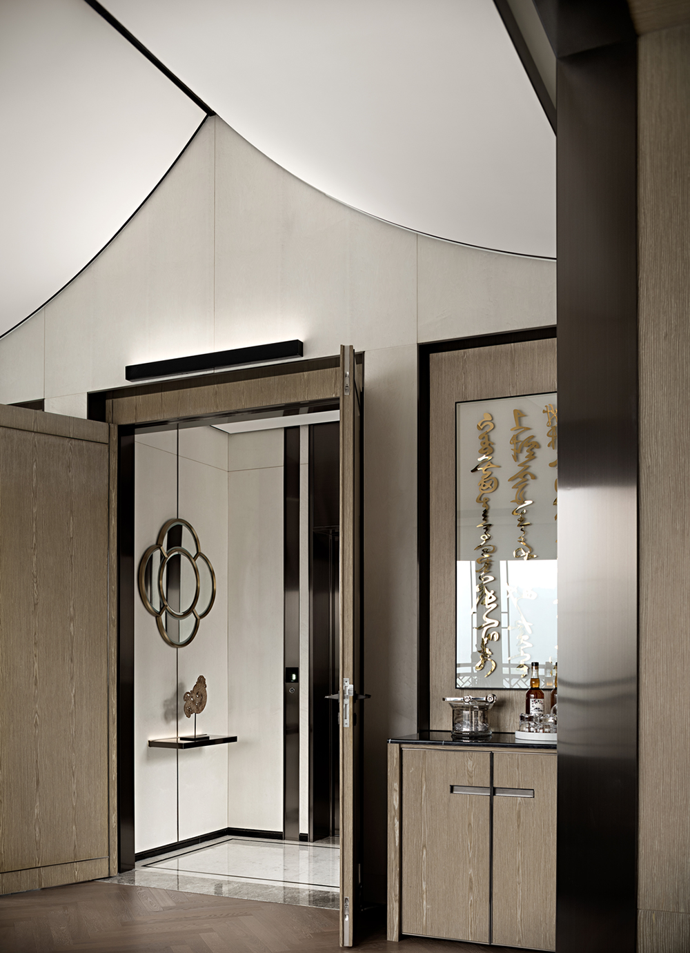 “精巧”和“简约”是本案室内设计的主题词,工艺的打磨贯穿了建筑和室内的全部细节中。设计师精心挑选了意大利鱼肚白、威尼斯棕等大理石天然材料,线性的纹理带来流动之美,体现精睿阶层的优雅高贵。