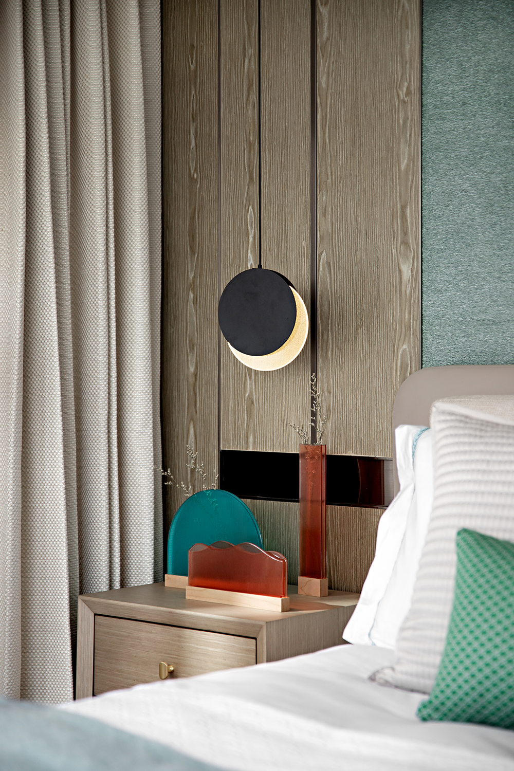小孩房卧室中床头的新月吊灯,与来自台湾的新锐设计品牌“单挑概念”所设计的双层押花玻璃花瓶共同带来朦胧的室内气氛和“镜花水月”的意向;