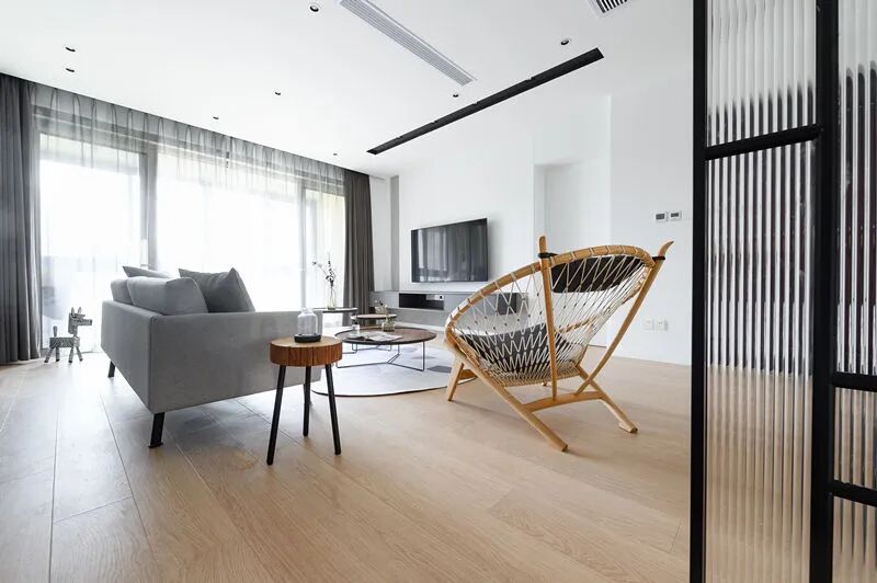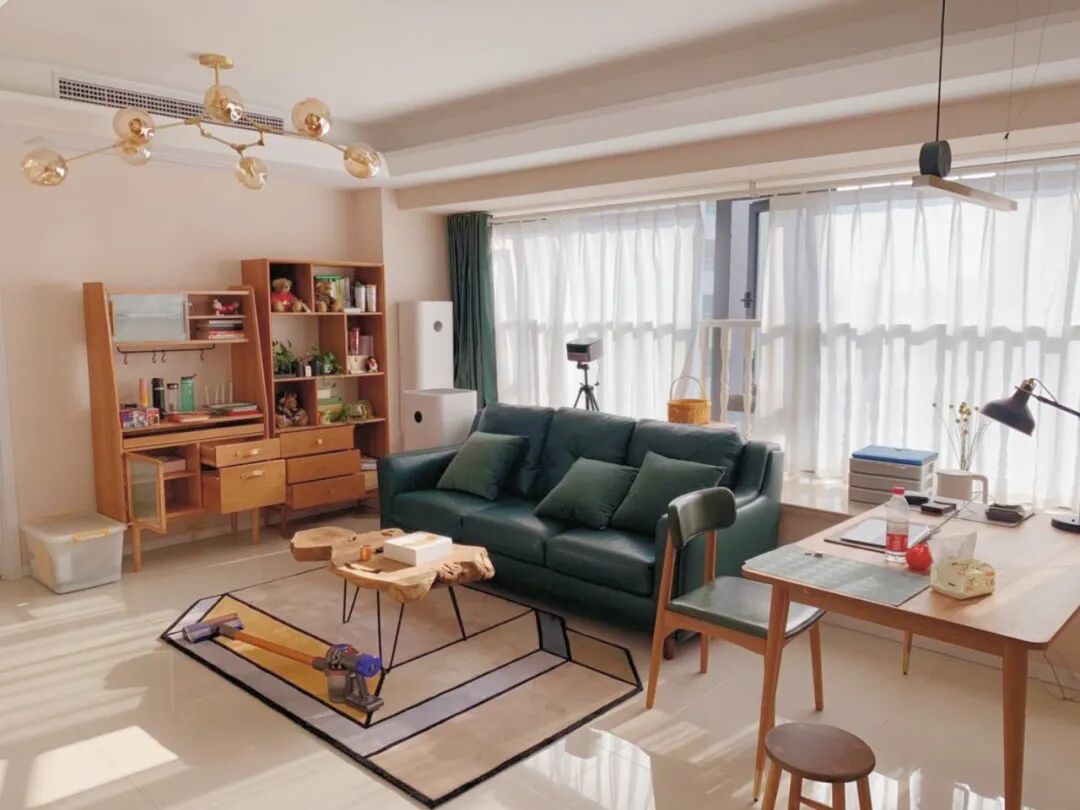 利用沙发后面的空间,打造一个办公区,半截玻璃+半截墙的设计,既保持空间的开阔,也让办公区有一定的私密空间不被打扰。