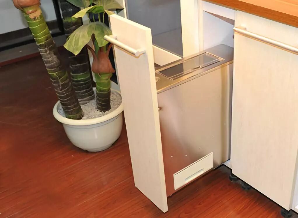 把米箱和垃圾箱隐藏起来在视觉上是非常舒服的,可以让橱柜的整体感更强,但是在后期使用过程中,你会发现,效果似乎并没有那么好,垃圾箱里最容易滋生细菌,不好清理,米箱用起来也怪麻烦的,不透气还容易长虫,总体看起来,性价比不高,独立的米箱和垃圾桶的价钱可比专门做拉篮便宜多了;