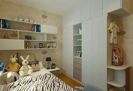 儿童的衣服不及大人的多,也没有大人的占地方,所以儿童的衣柜在上层可以采用大通体的设计,用来放被子等生活用品,下层可以收纳儿童的玩具、小杂物等。