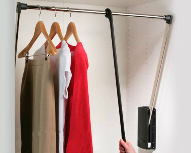 老年人活动不宜过大,可以在衣柜里装上拉衣杆,即使平时把衣服高高挂起,也只需要轻轻一拉,就可以吧衣服拉下来了。