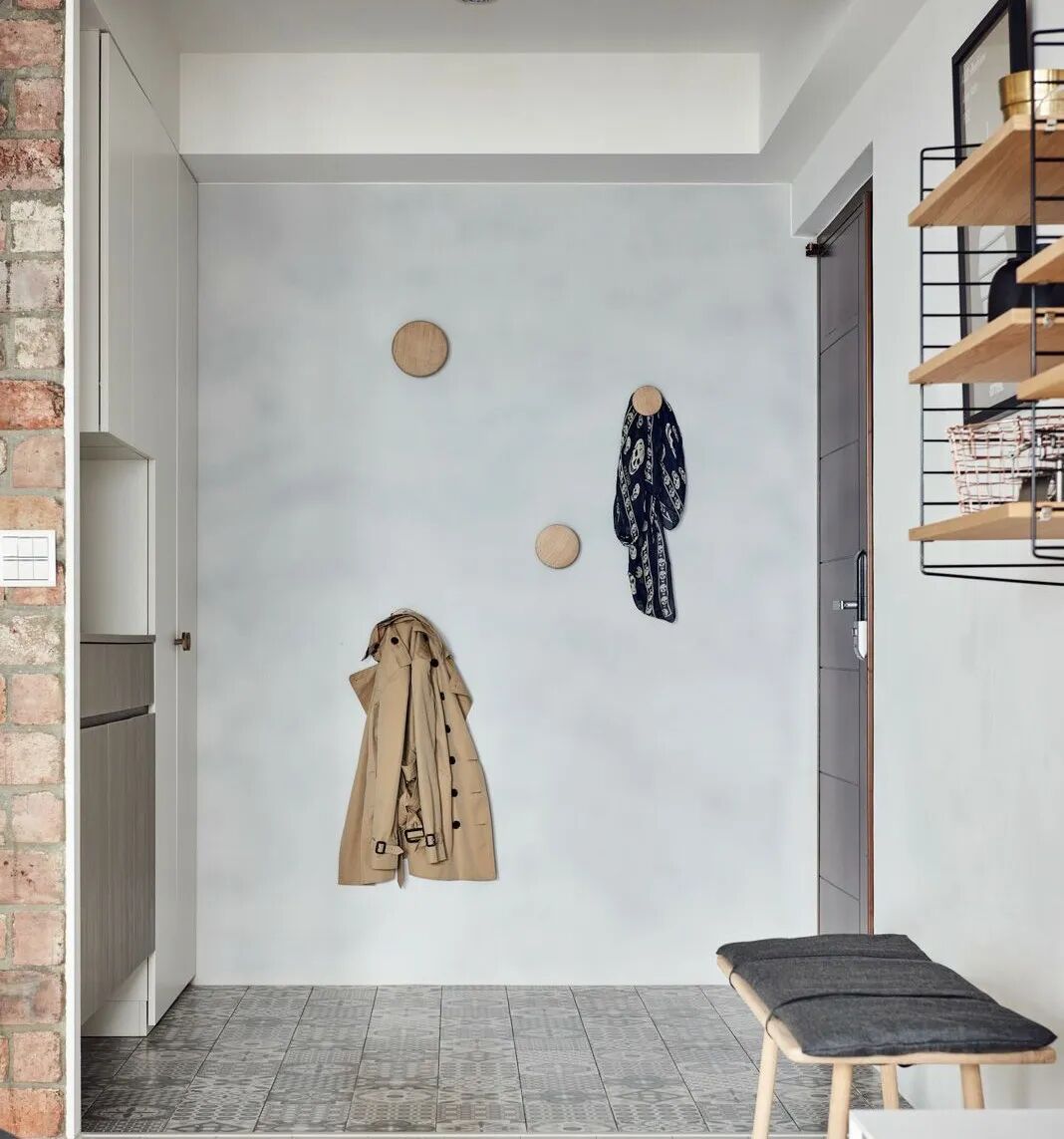 外出穿的衣物一般建议在门厅就脱掉,这样预留一面挂衣墙必不可少,如果位置空间大挂衣区可内嵌于鞋柜中,下面设置换鞋凳。美观又实用。