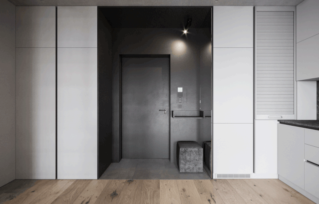 入口的设计很有意思,通过狭窄的玄关,视野将豁然开朗。左侧是厨房区域,黑白配色简洁利落,线条感十足。