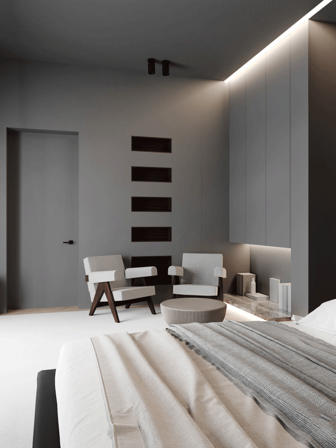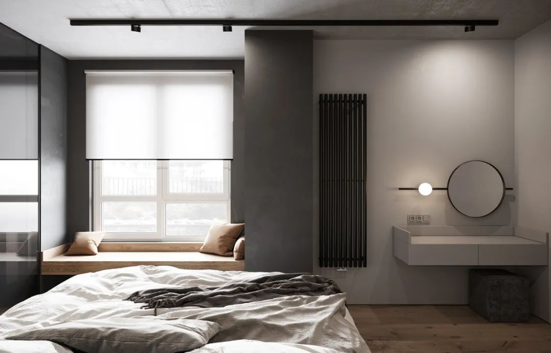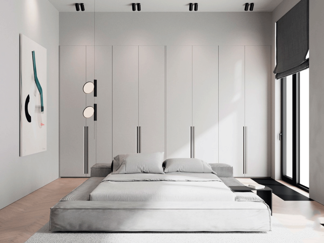 次卧主色调为较浅的灰色,与墙面同色的橱柜“隐形”了储存空间。