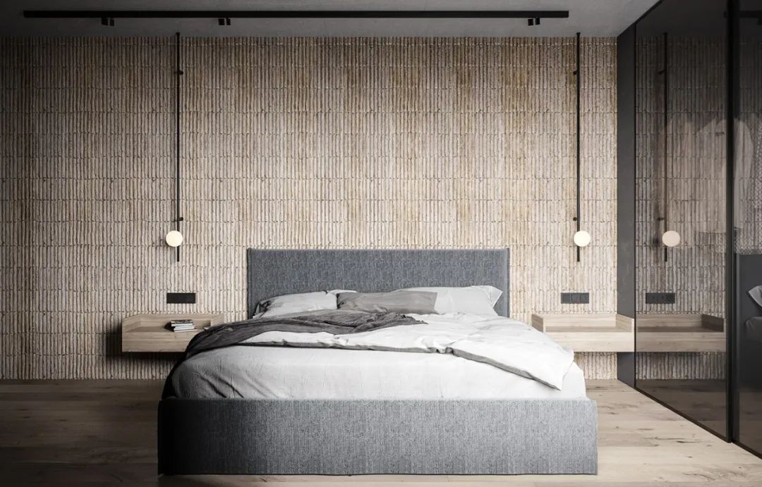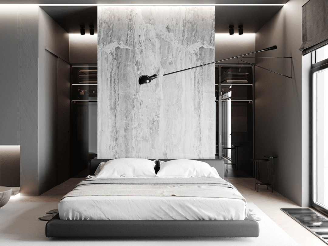 主卧保持与公共区域一致的灰色调。床头大面积的大理石隔断背景墙非常吸睛,质感满满。