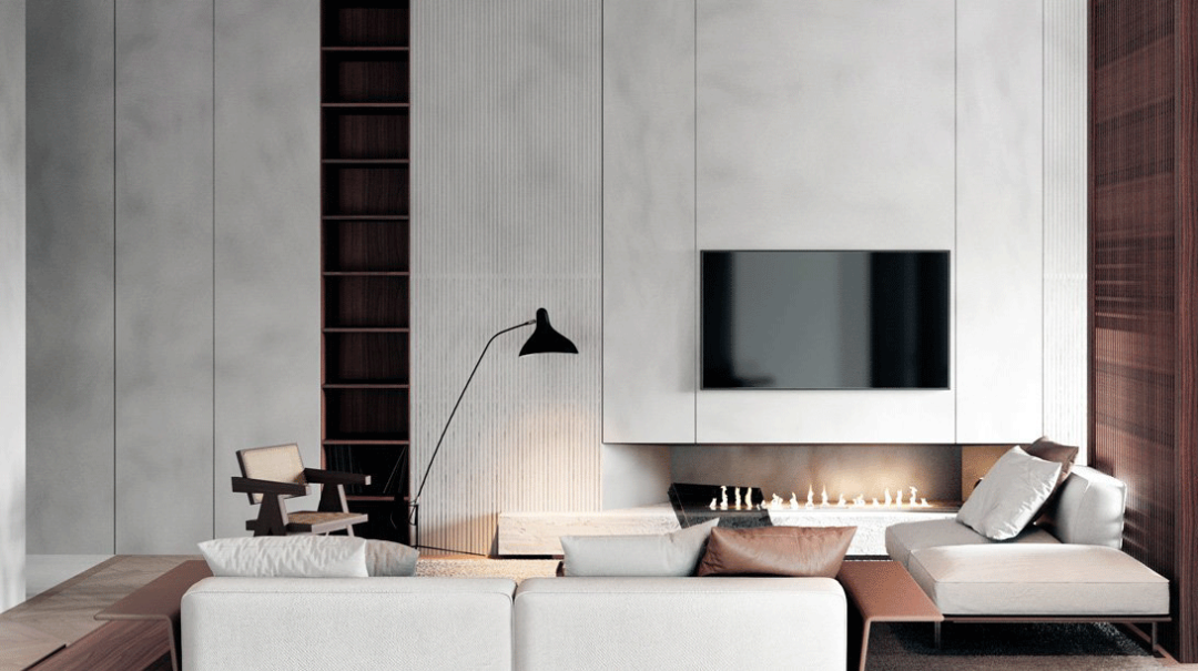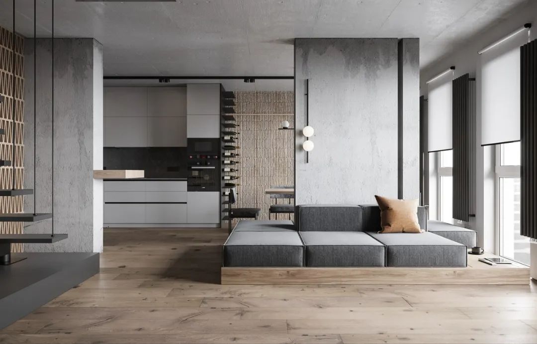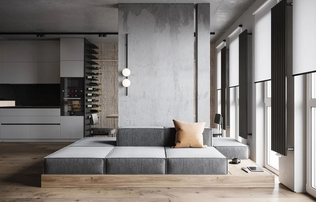 沙发环绕一面混凝土隔墙排布,别致不俗。