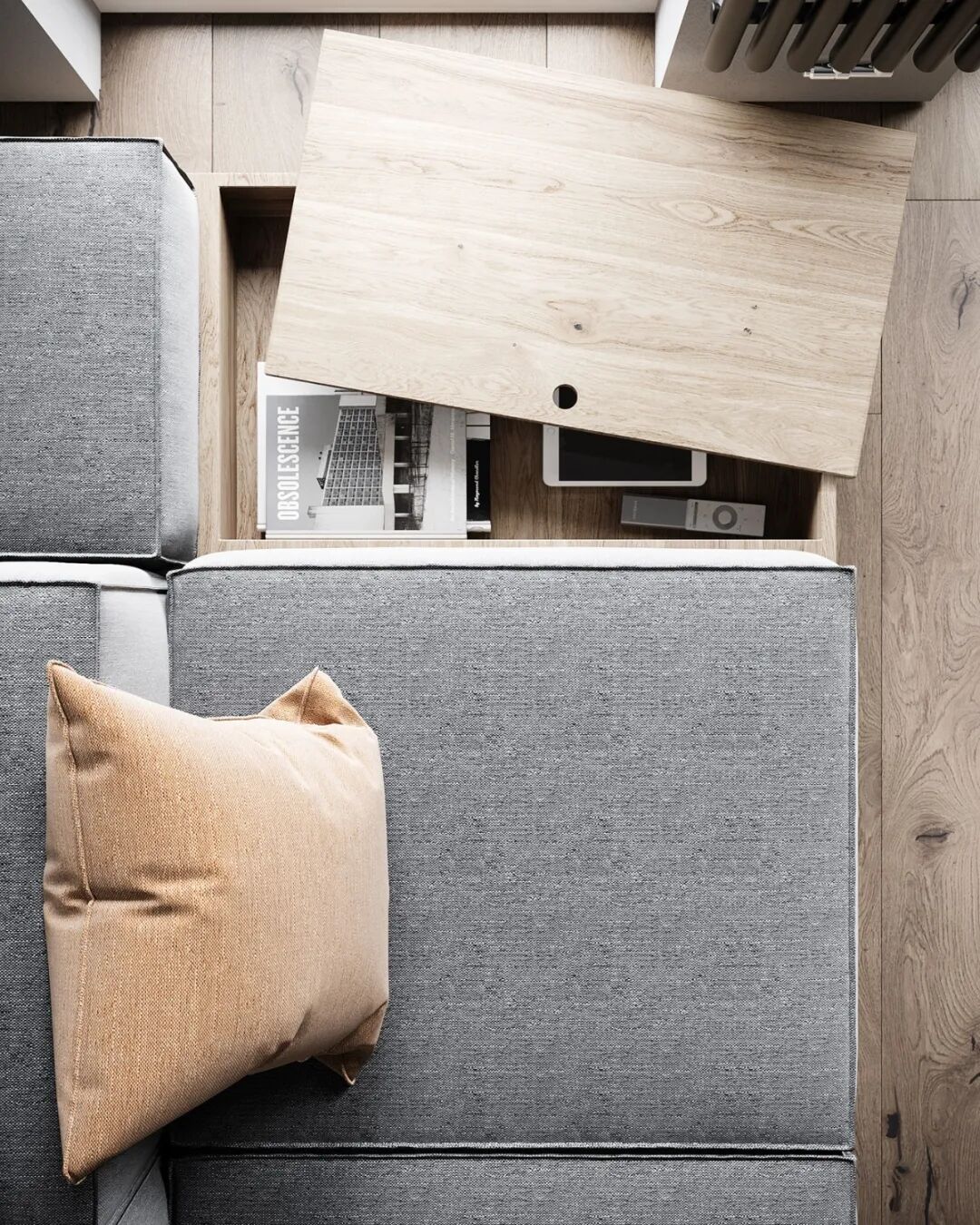 灰色调的客厅简约沉静,开放式布局将其与餐厨区域相关联。以一组沙发作为空间隔断,简单不失时尚感。