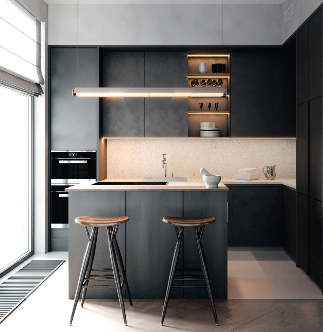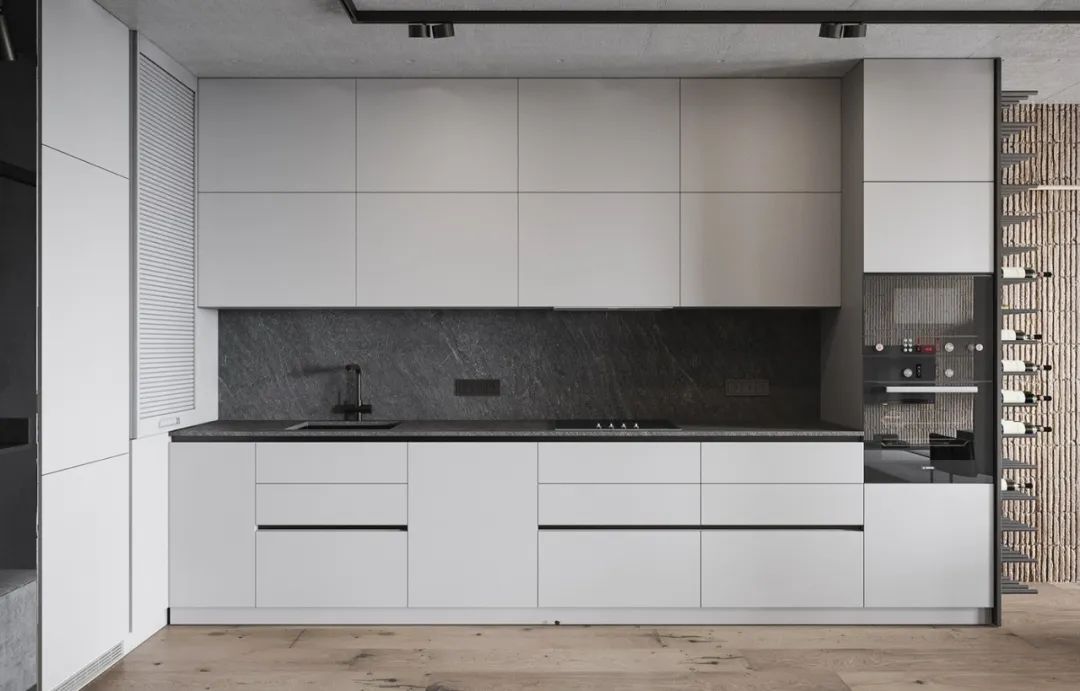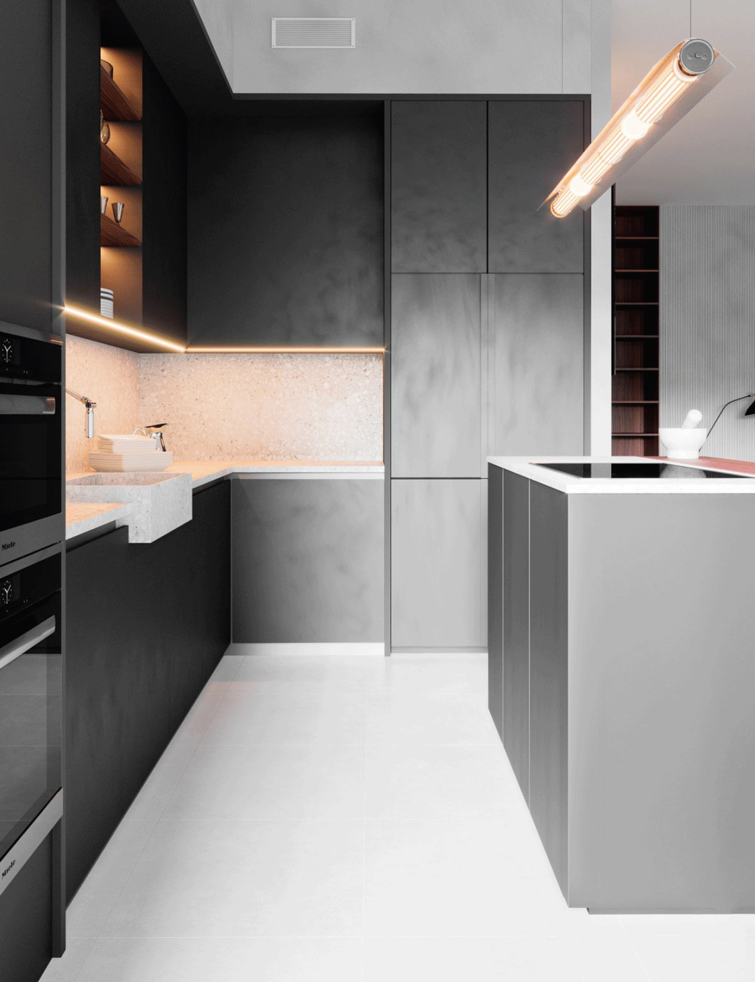 厨房是经典的黑白灰配色,这里的灯带设计非常别致。