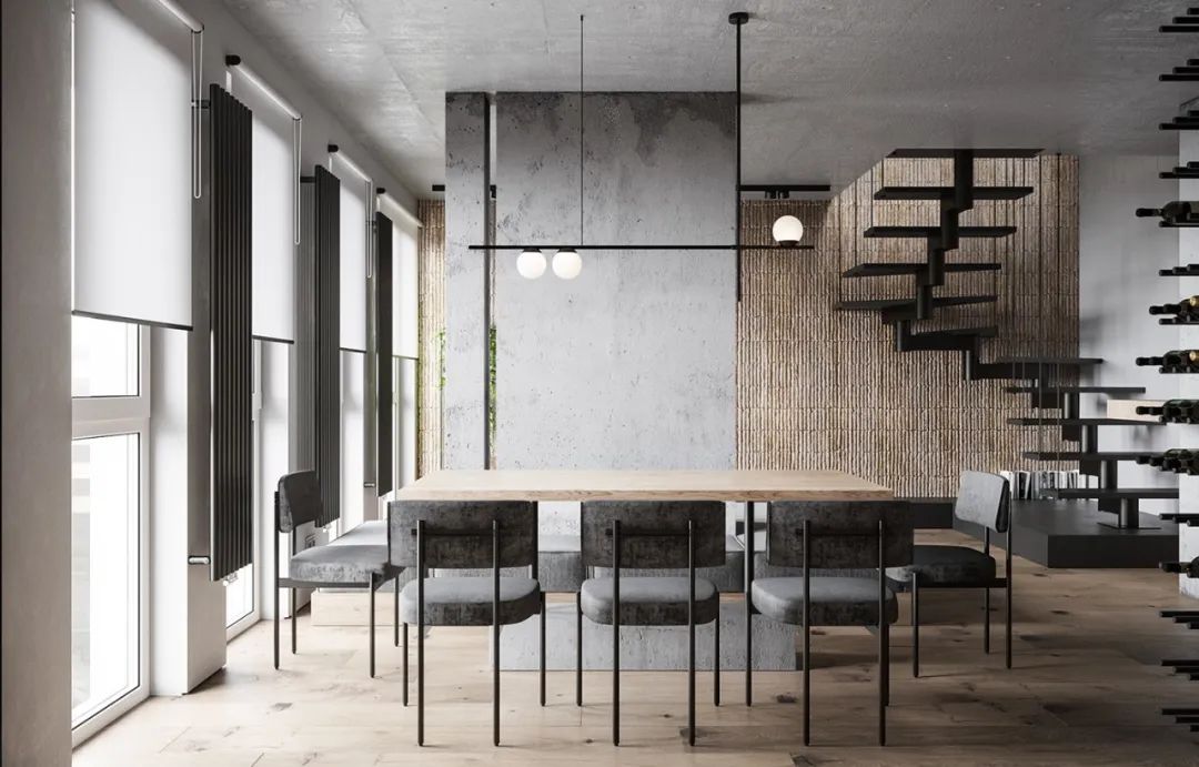 混凝土隔墙同时起到隔断的作用,将客厅与餐厅巧妙的分隔开来。