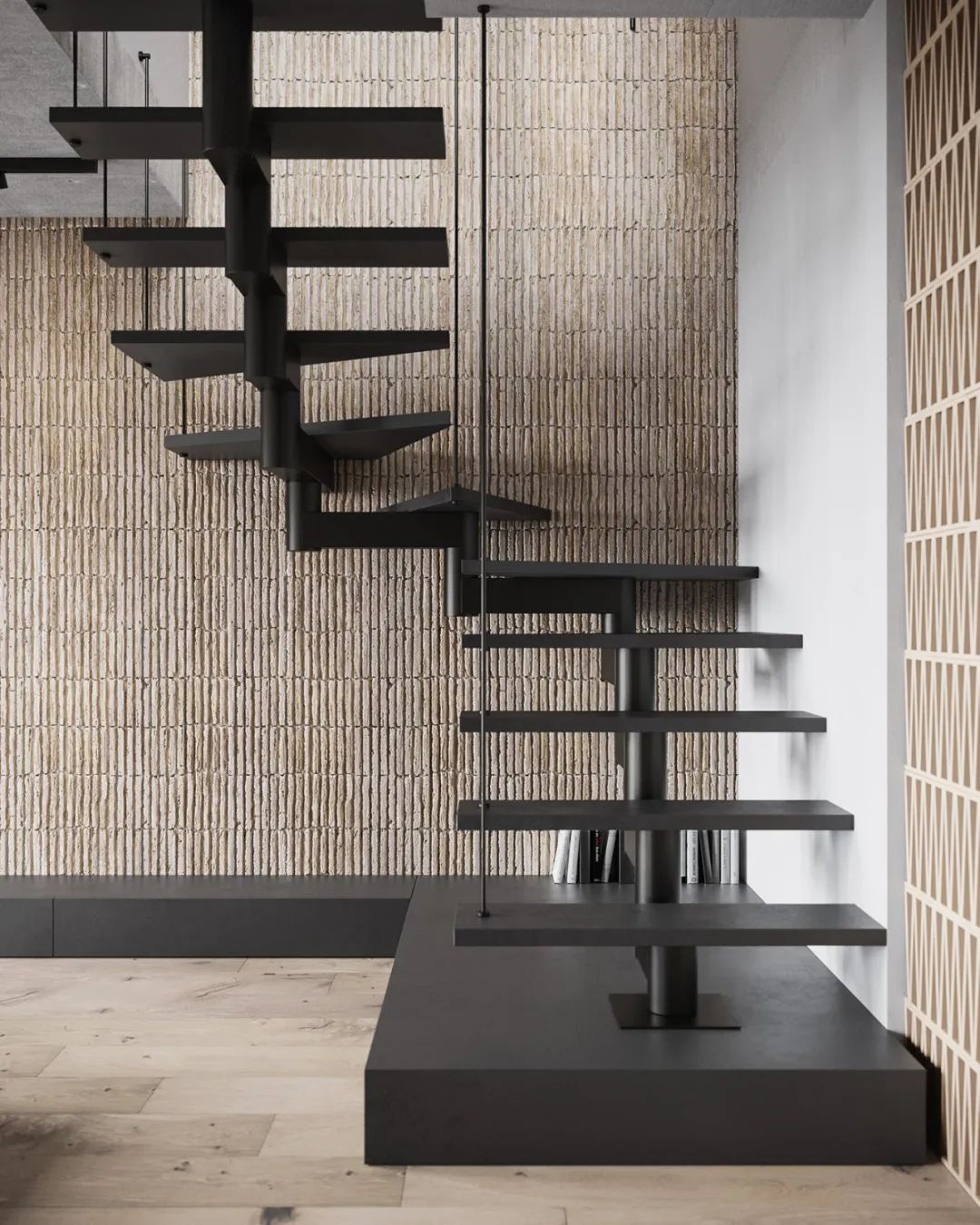 石材墙面通到二楼,与同色系的木格栅隔断相协调,质朴极简。