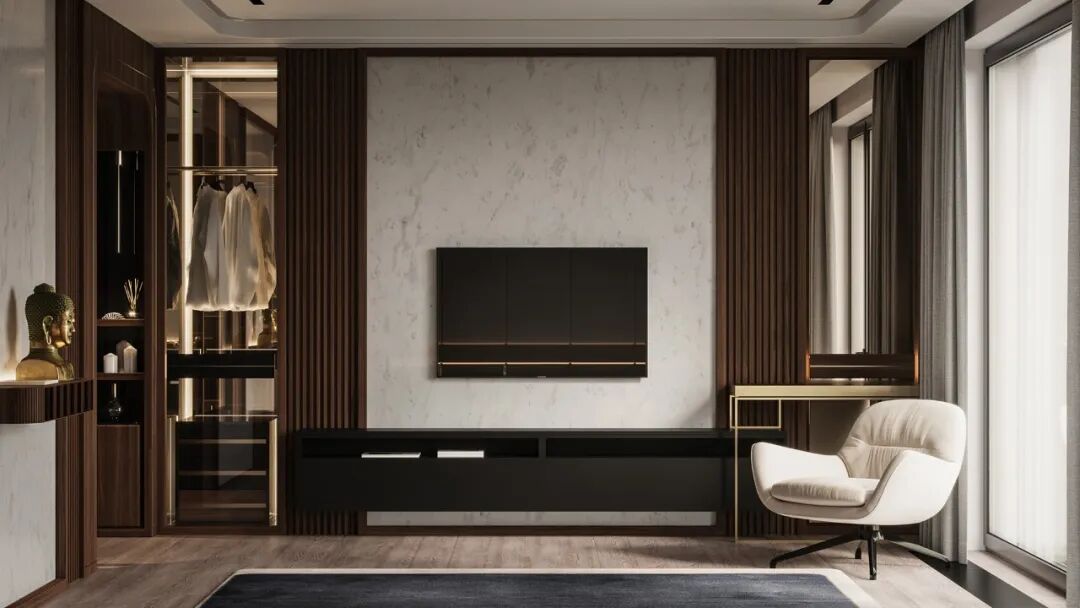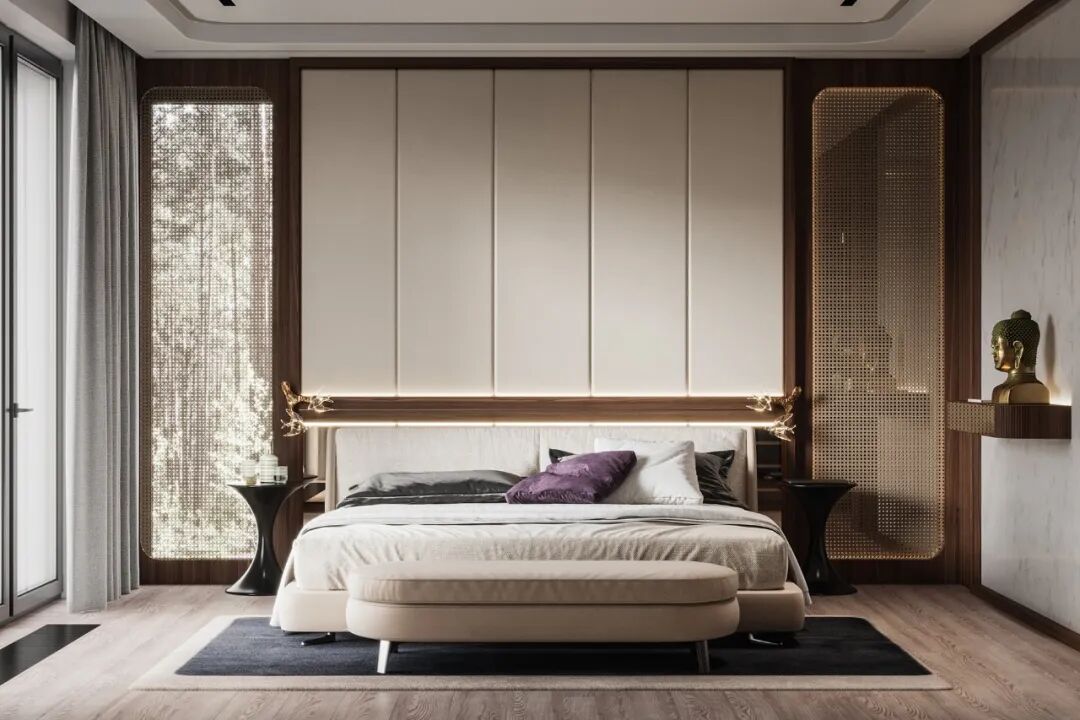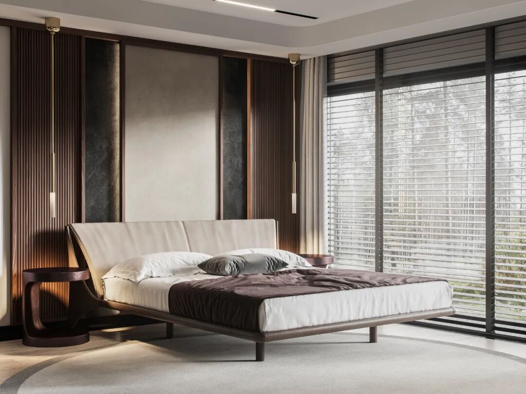 主卧空间 ,丰富的材料层次在和谐的色调中化繁为简 ,简约不失雅致。