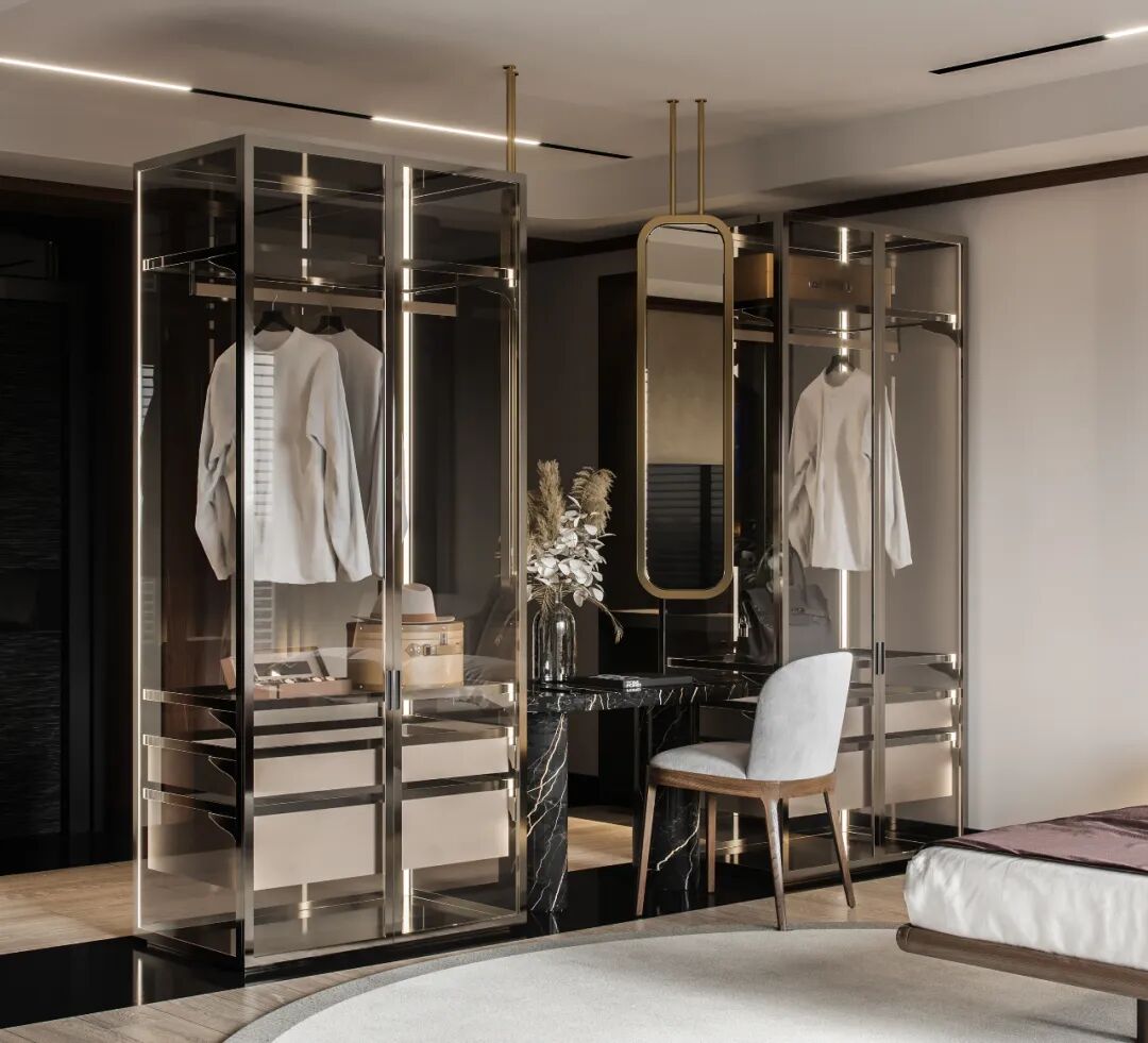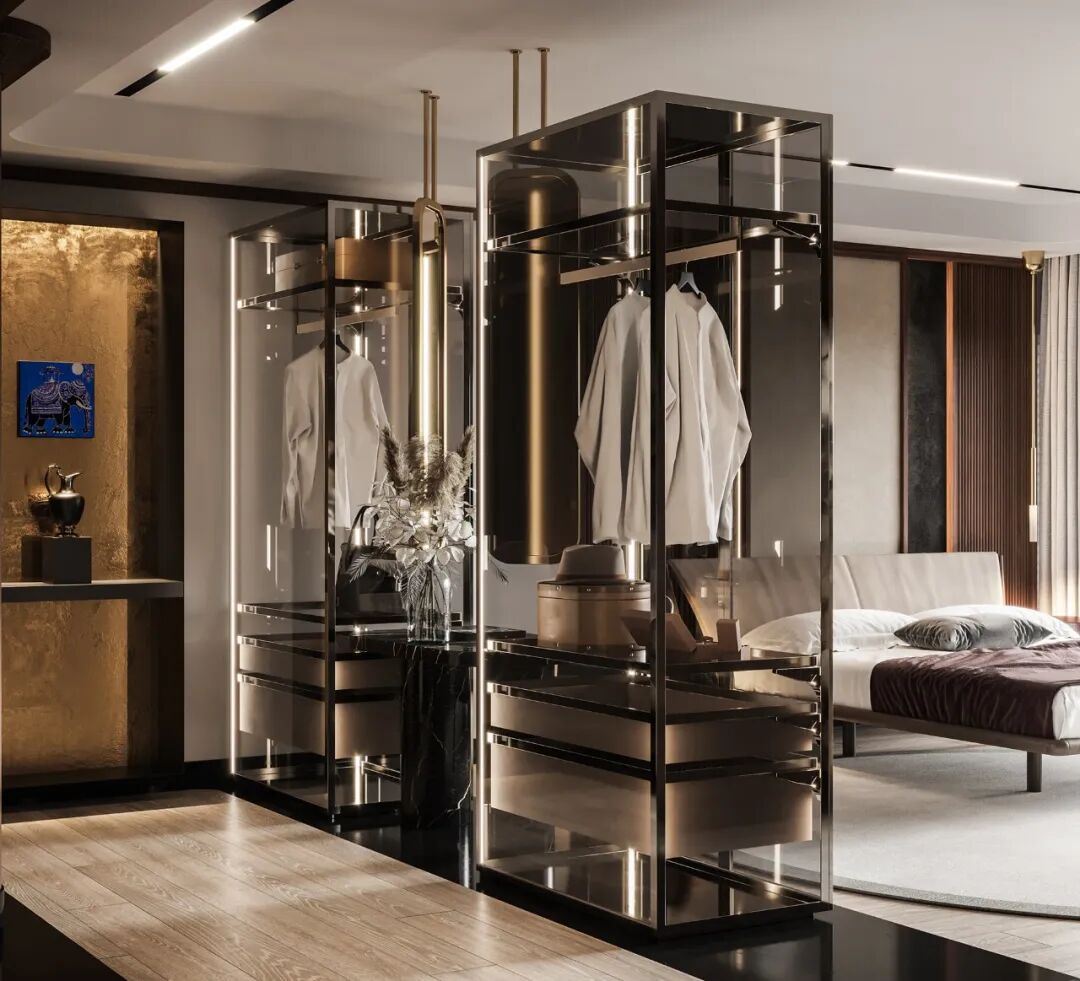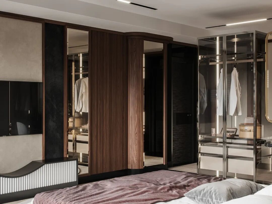 一侧的 透明衣柜 奢华感十足,将空间再度拉回高调的氛围之中。这个衣柜同时也 是卧室和主卫的视线隔断 。
