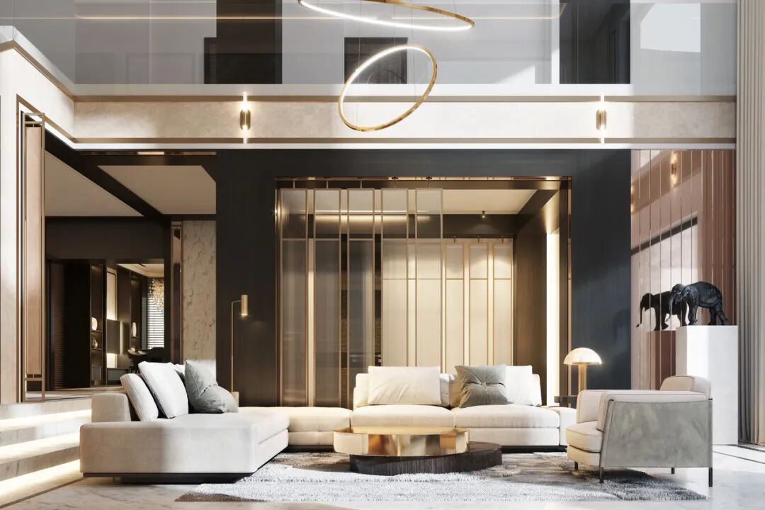 客厅与二层相连,高阔的布局与奢华风格相得益彰。