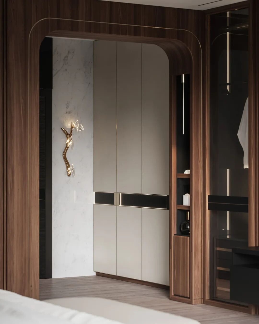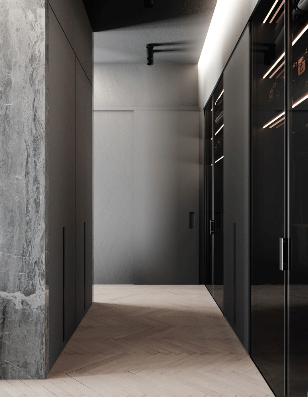 隔断后方是一个半开放式衣帽间,茶色玻璃与灰色木门虚实相接,形成独特的美感。
