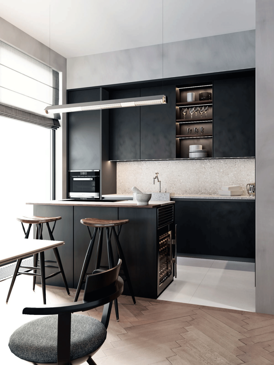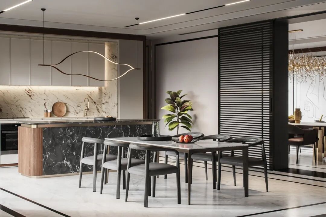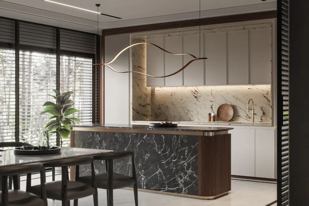 岛台如同一个自然的隔断,与地面设计相结合,形成明确的空间划分。