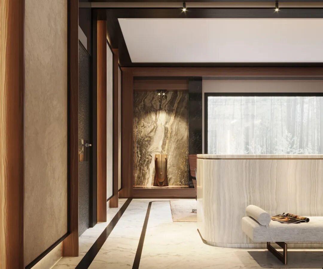 入口的另一侧,巧妙嵌入了两面隔断墙,混凝土与木格栅呈直角排布,冷与暖、虚与实的对比形成强烈视觉冲击,美感独特。