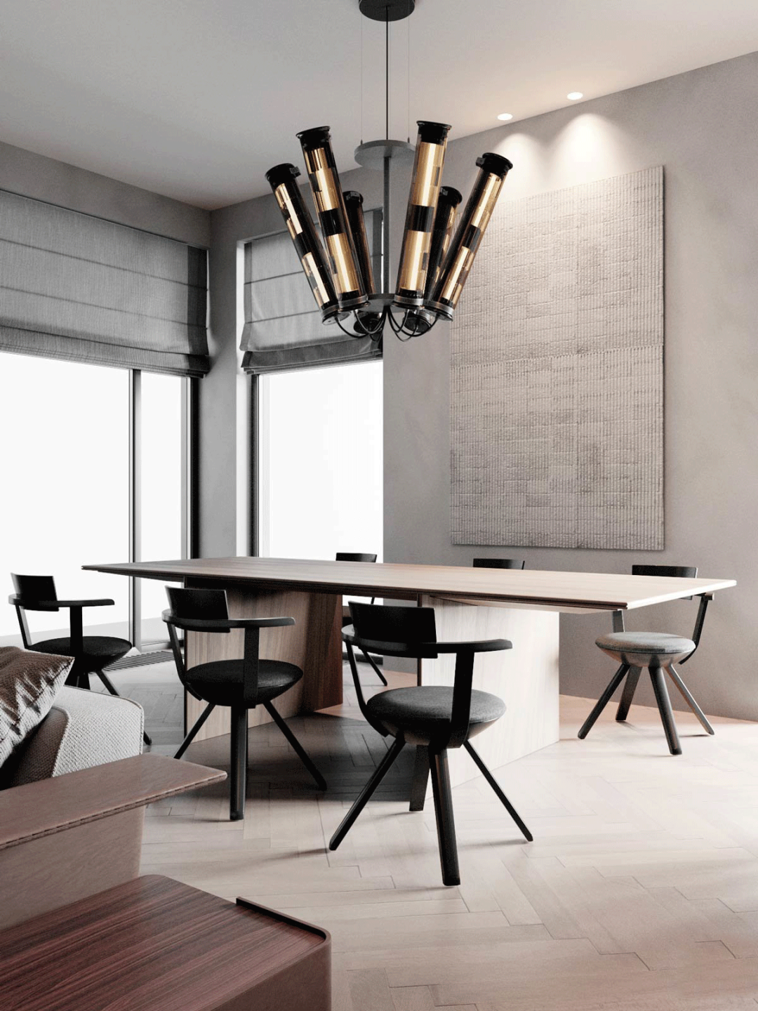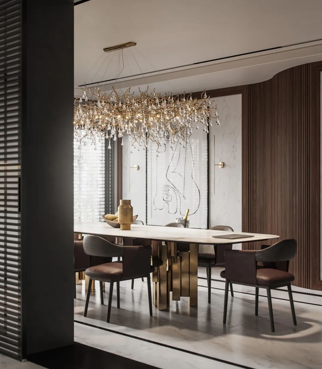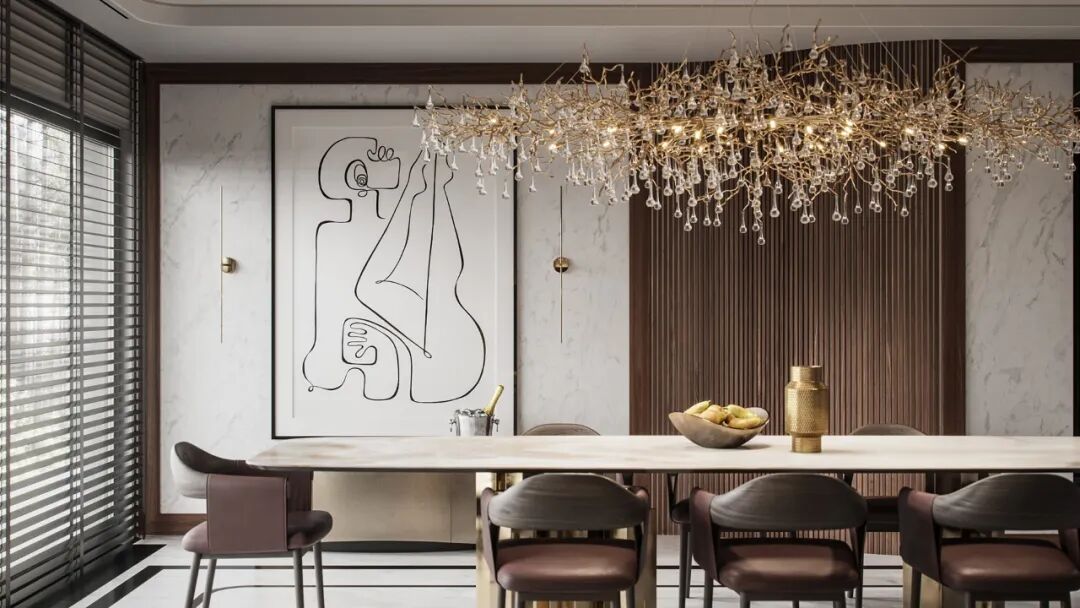 餐厅区域,一盏繁复的吊灯瞬间提升了空间的奢华感。
