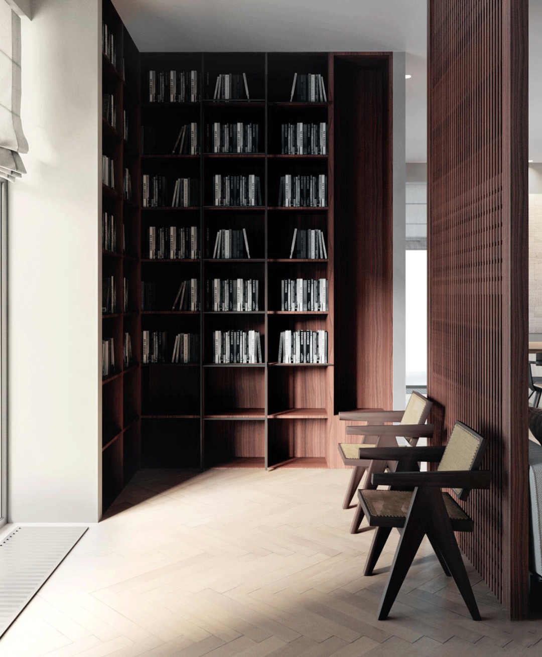 客厅一侧设有一个独立的阅读空间,3米高的木质格栅隔断营造出静谧的阅读氛围,同时也不会阻挡室内的采光。
