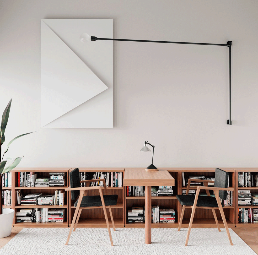 正对床的位置设置为阅读区,低矮的书柜令空间重心下沉。简约的设计烘托出安静书香气。