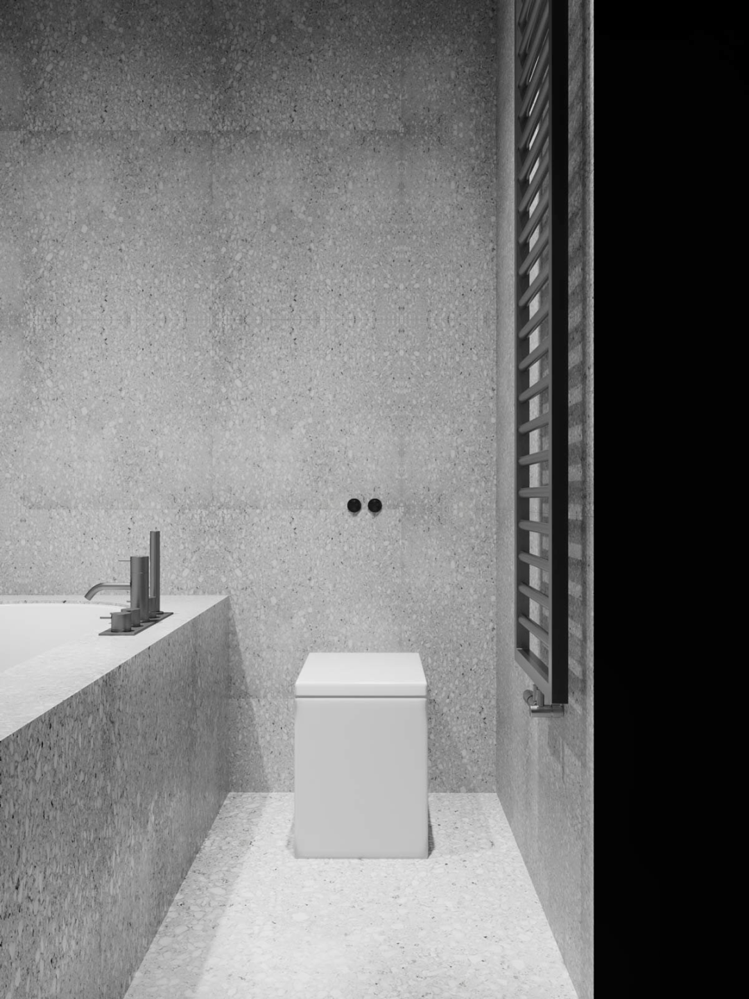 两间卫生间的主材均为水磨石,设计简约利落,视感舒适。