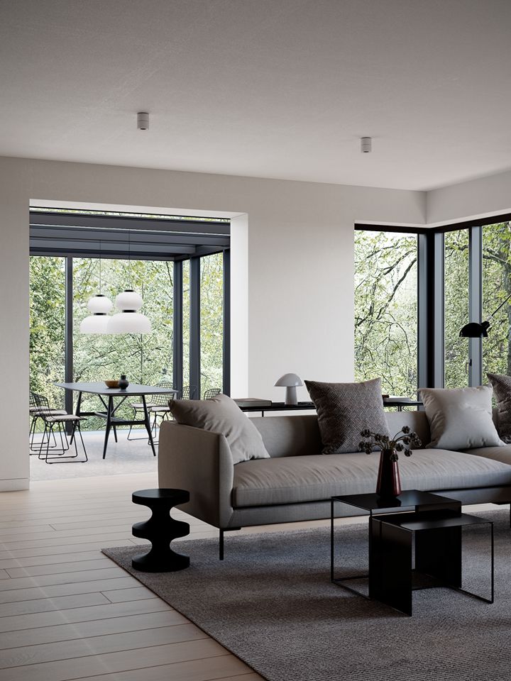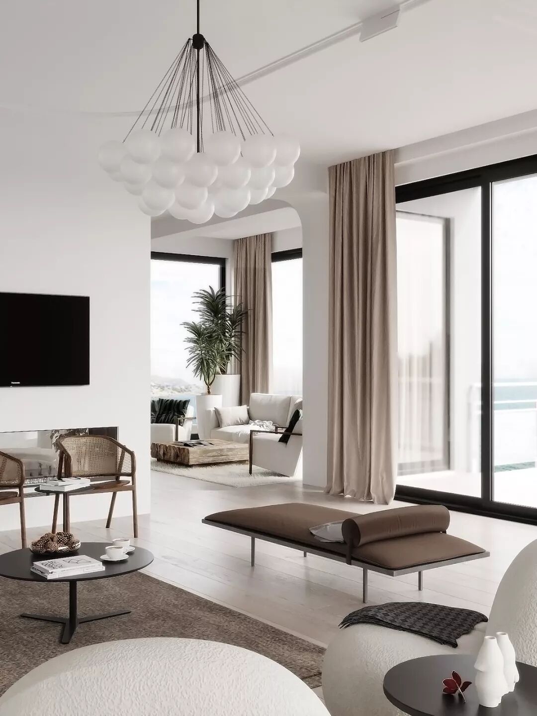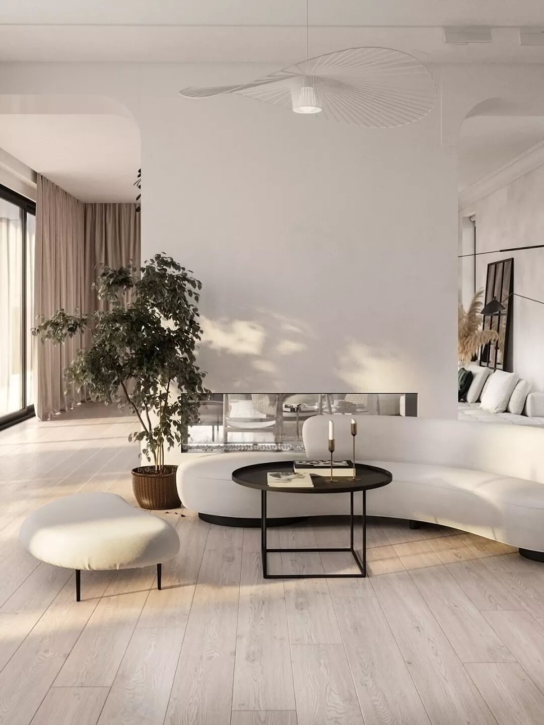 大面积的落地窗有利于阳光进入纯白的室内,构建出优美律动的光影世界。