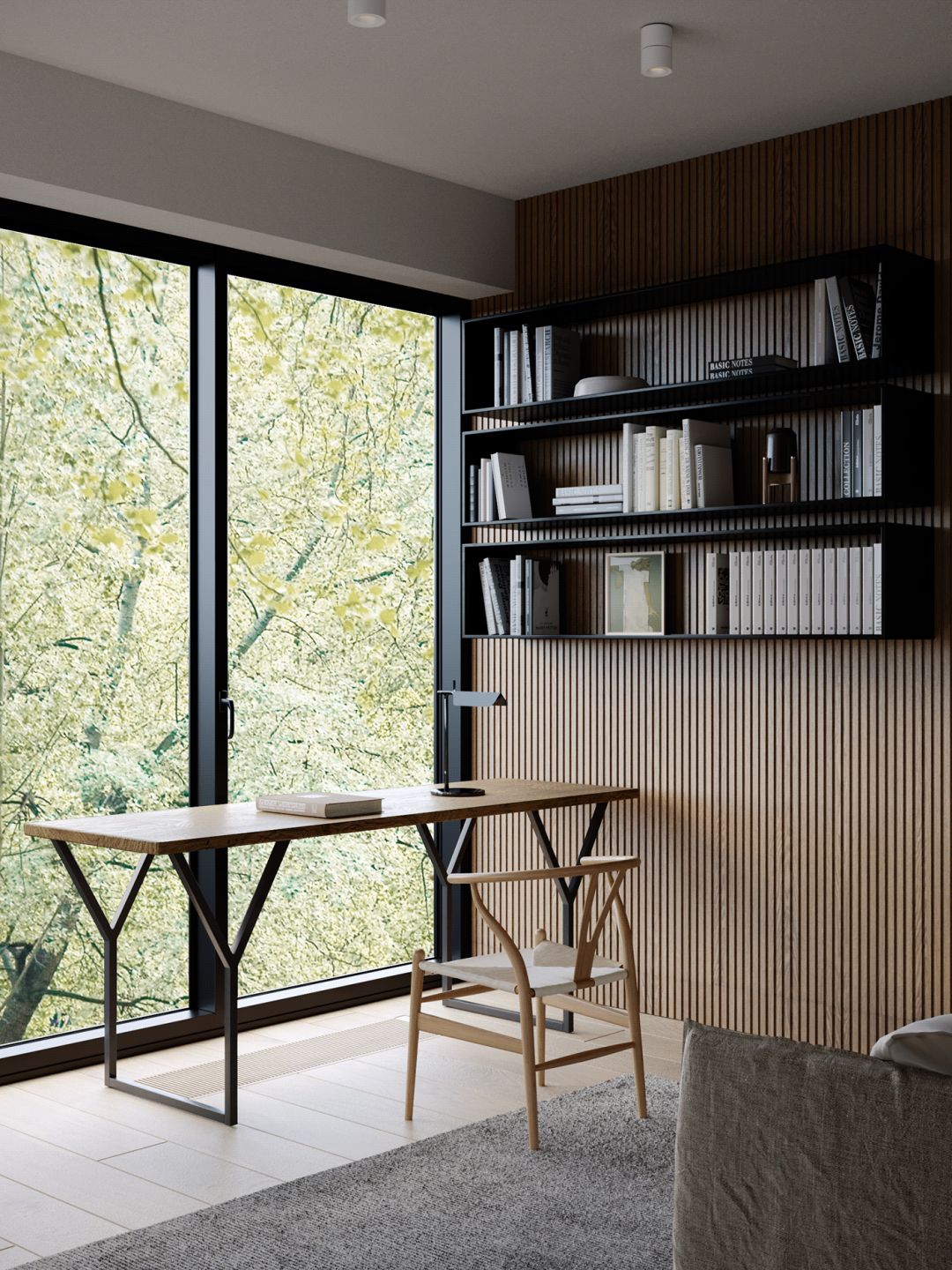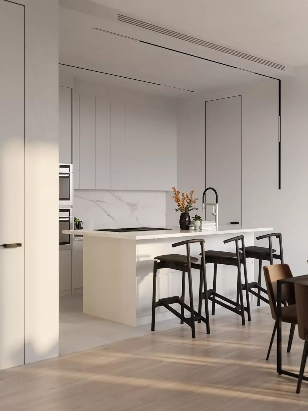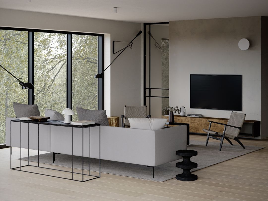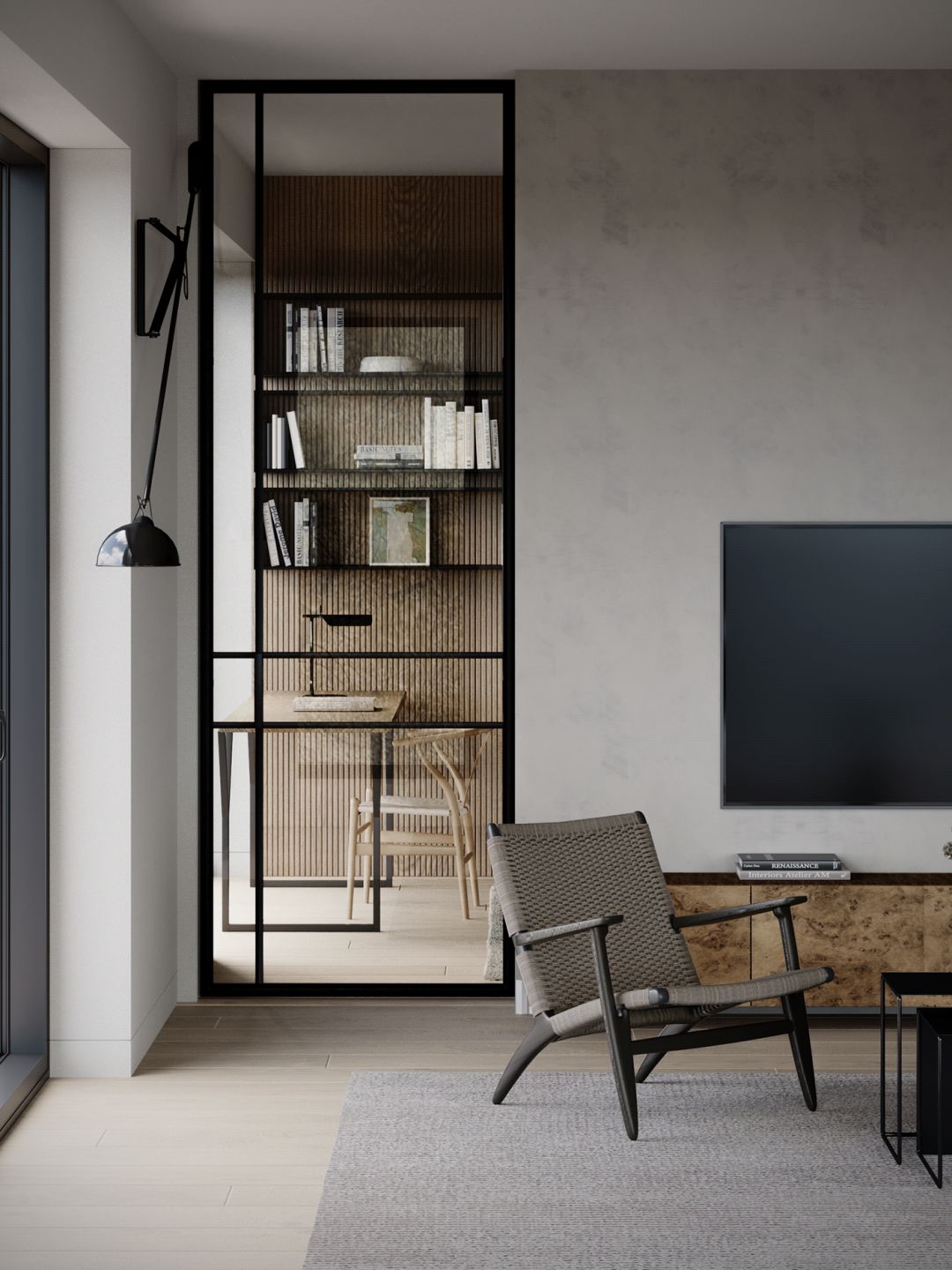 洗练的空间线条,辅以轻盈通透的玻璃隔断、落地窗,大幅增强了室内与室外之间、室内各个区域之间的联系。