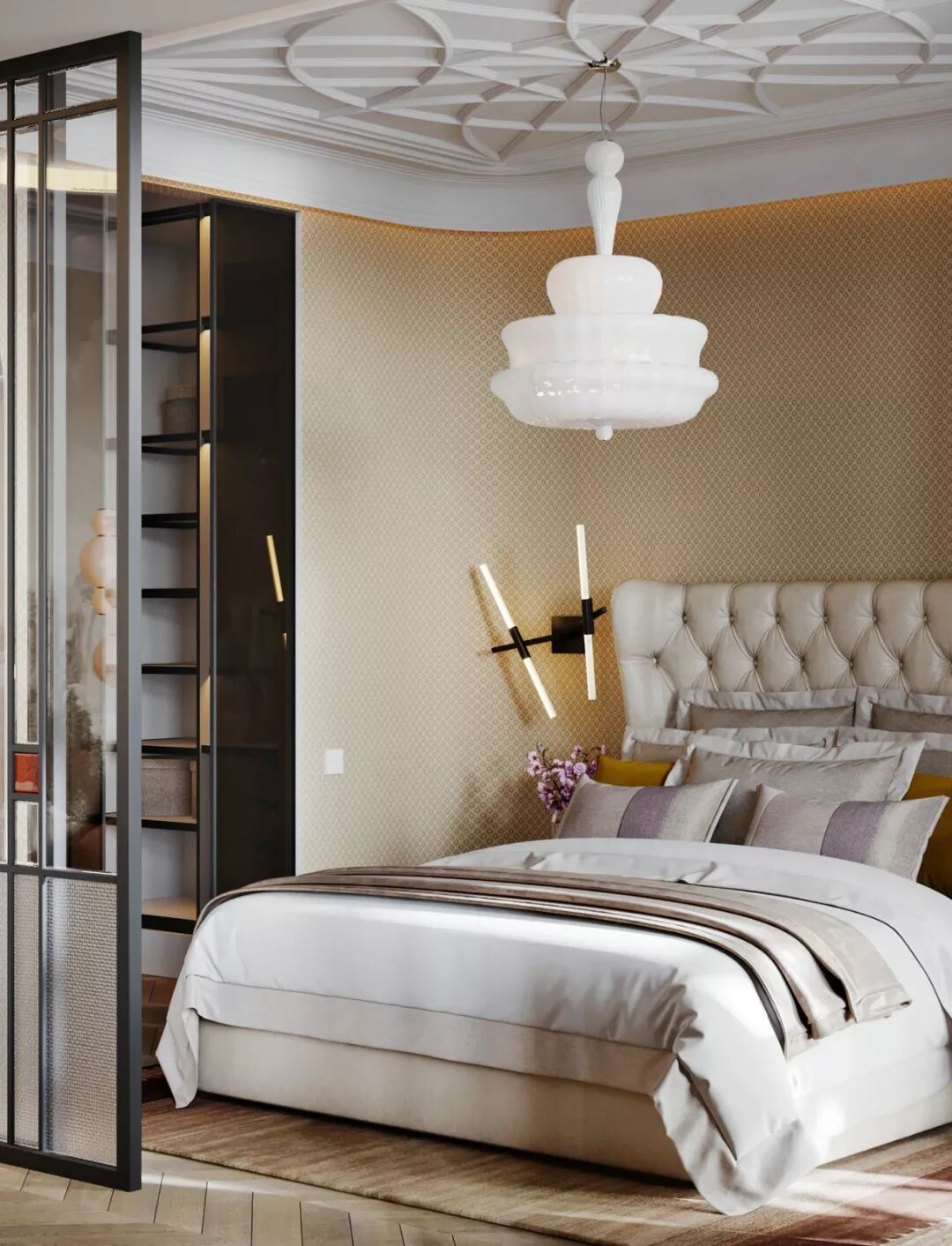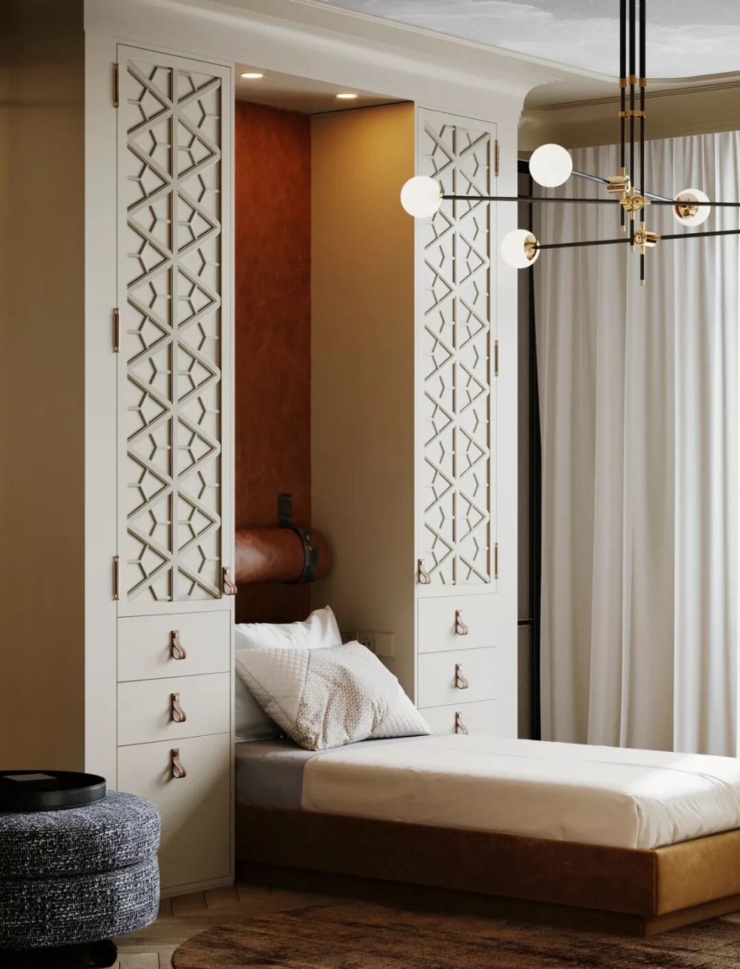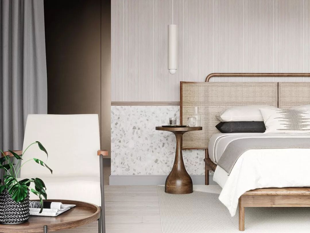 卧室的氛围同样静谧典雅 ,床头背景墙和地毯的几何造型,给人以 经典复古的视感。
