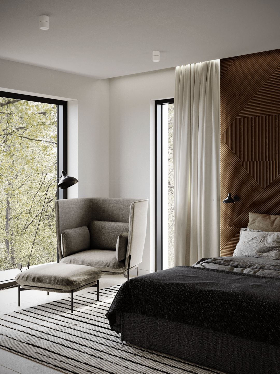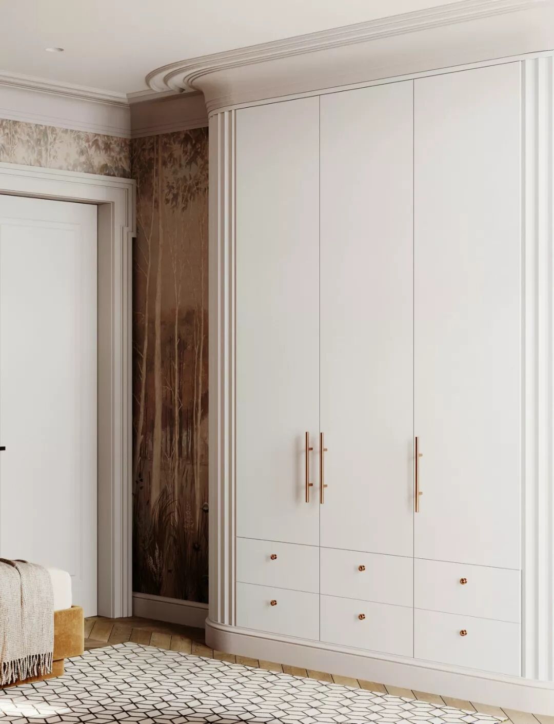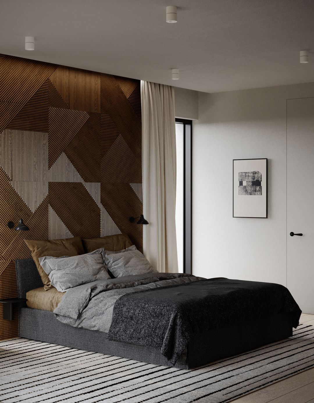 卧室的氛围同样静谧典雅 ,床头背景墙和地毯的几何造型,给人以 经典复古的视感。