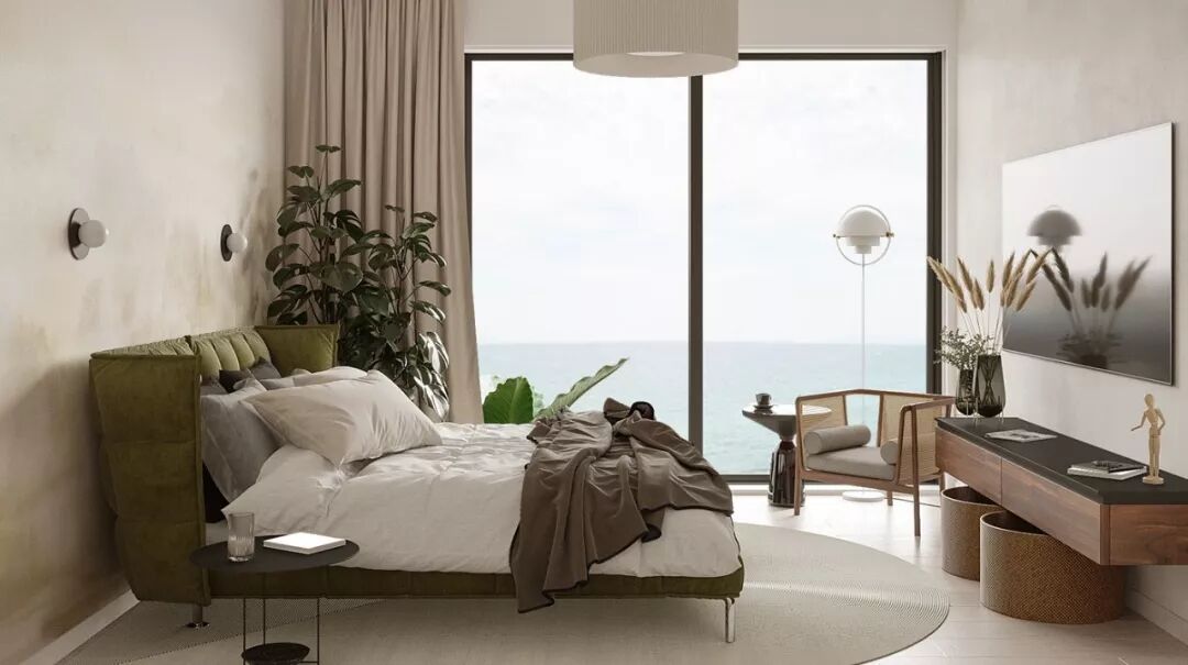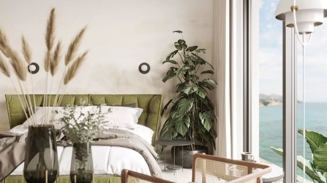 主卧同样拥有一面落地窗,纵观壮阔海景。清新柔和的色调舒适自然,绿色的床以及藤编元素,无形增添了几分复古感。